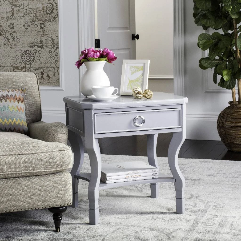 A stay in Belgravia’s most decadent new hotel inspired this modern grey nightstand. Finely crafted to evoke traditional style with a modern edge, its gently curved legs and chic silver hardware make it timeless. Designers love its ample storage drawer. Dust regularly with a soft, dry cloth. Never use oiled or treated cloths on lacquered finishes. Some finishes can be wiped with a damp (not wet) cloth, followed at once by rubbing with a dry cloth to remove fingerprints and smudges. For persistent spots, gently clean with a soft cloth and a solution of water and mild soap, make sure to wipe dry. Use adhesive felt pads, coasters and placemats to protect your furniture.