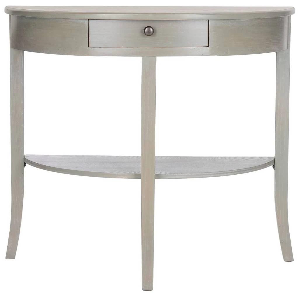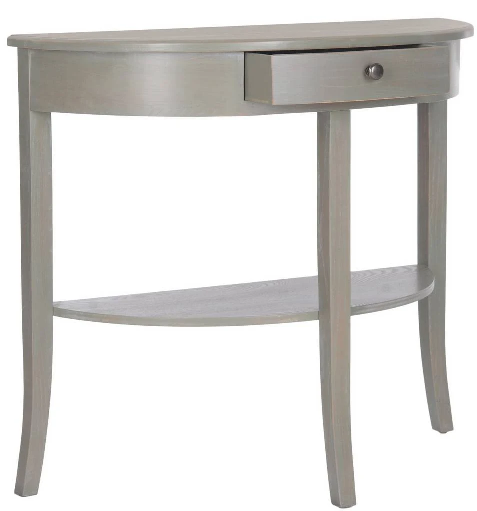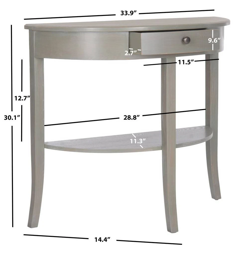 With clean lines inspired by Spanish traditional furniture, the Alex Console adapts to a myriad decorating themes. Finely crafted of elm in an ash grey finish, Alex provides storage and style with its lower shelf and single drawer. Designers love its demilune silhouette.