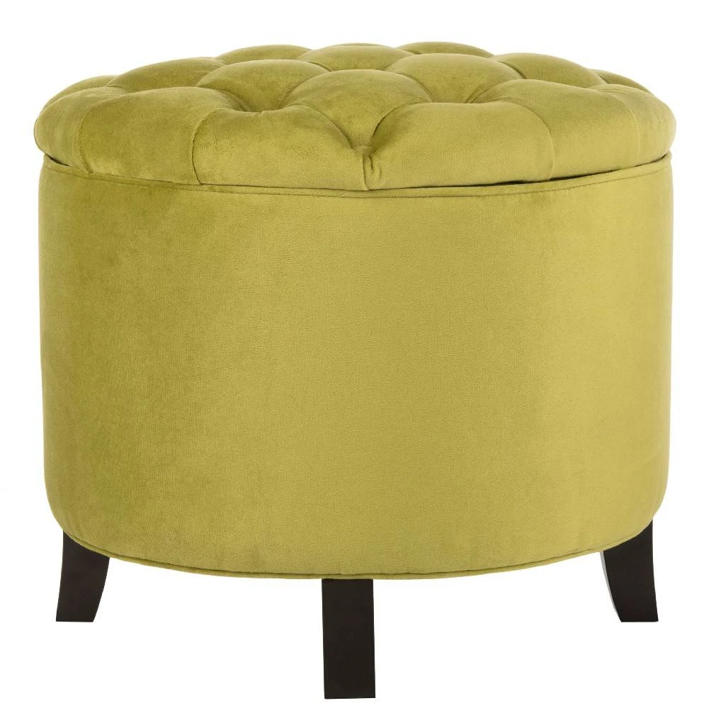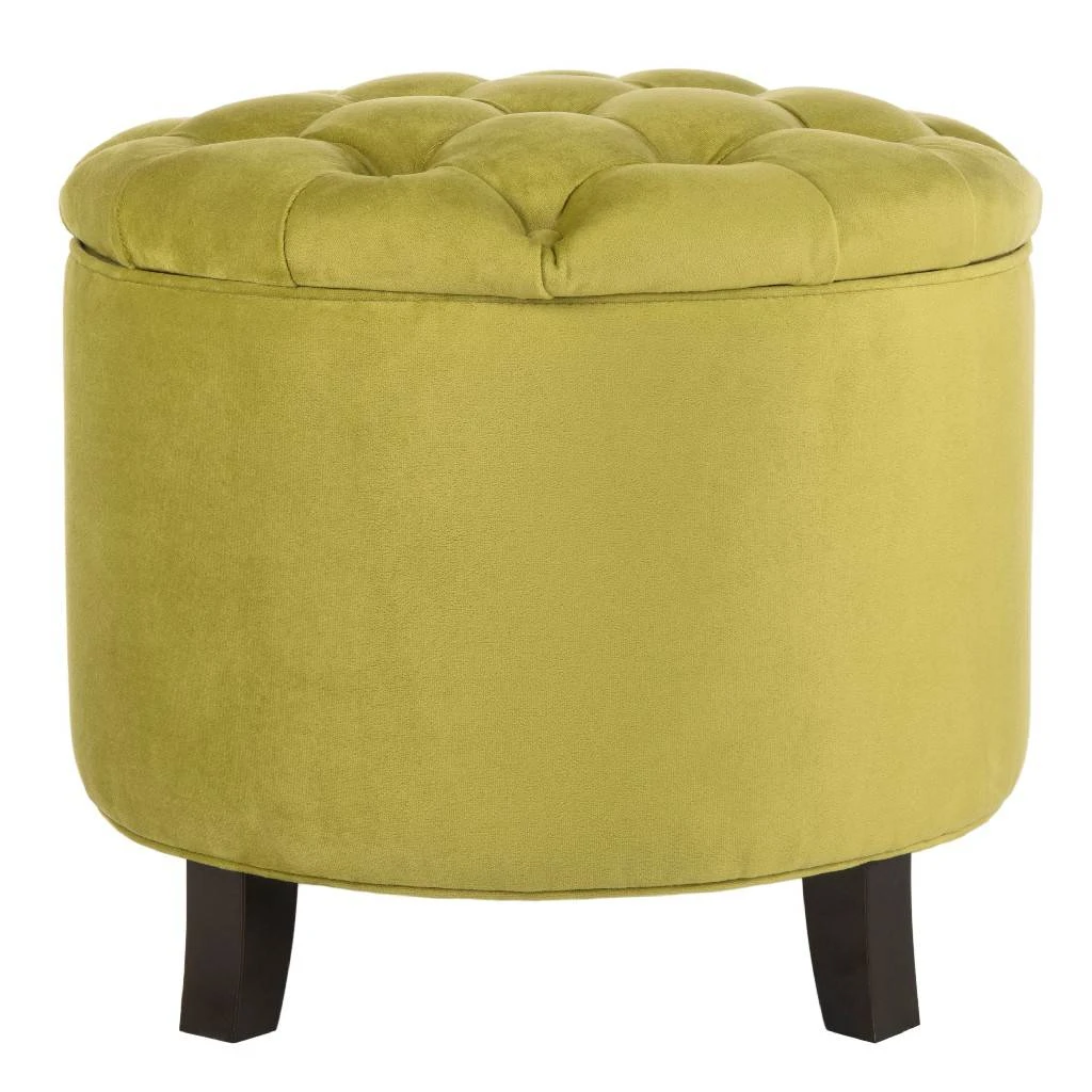 The quintessential storage ottoman, Amelia is transitional in design with button tufted removable quilted top and oak legs with rich espresso finish. Practical and fashion right, the Amelia tufted ottoman is upholstered in light green cotton velvet, and striking in , family room or master suite.