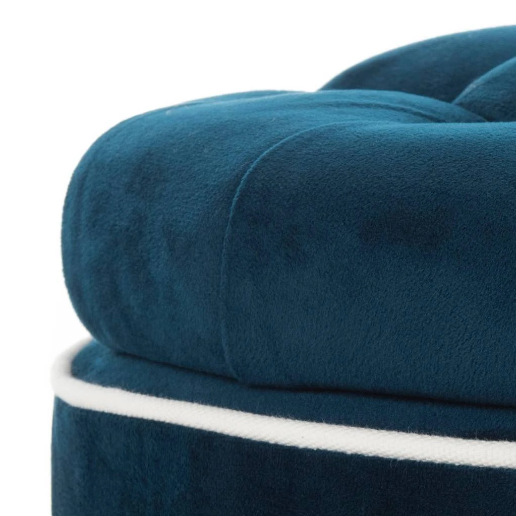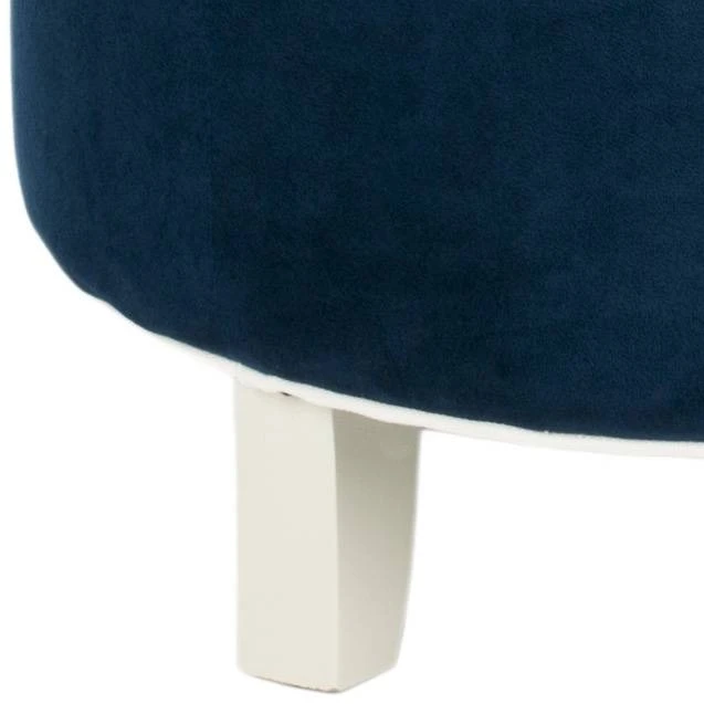 The quintessential storage ottoman, Amelia is transitional in design with button tufted removable quilted top and oak legs with pretty eggshell finish. Practical and fashion right, the Amelia tufted ottoman is upholstered in navy cotton velvet, and striking in , family room or master suite.