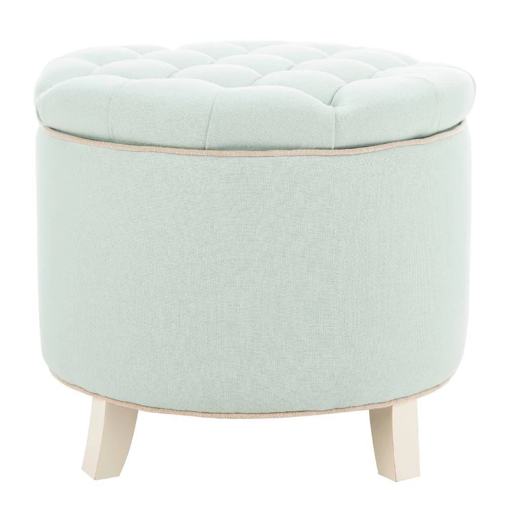 The essential storage ottoman, Amelia is transitional in design with button tufted quilted top and oak legs crisp ivory finish. Practical and fashion right, robin’s egg blue linen fabric is contrasted with cream welting.