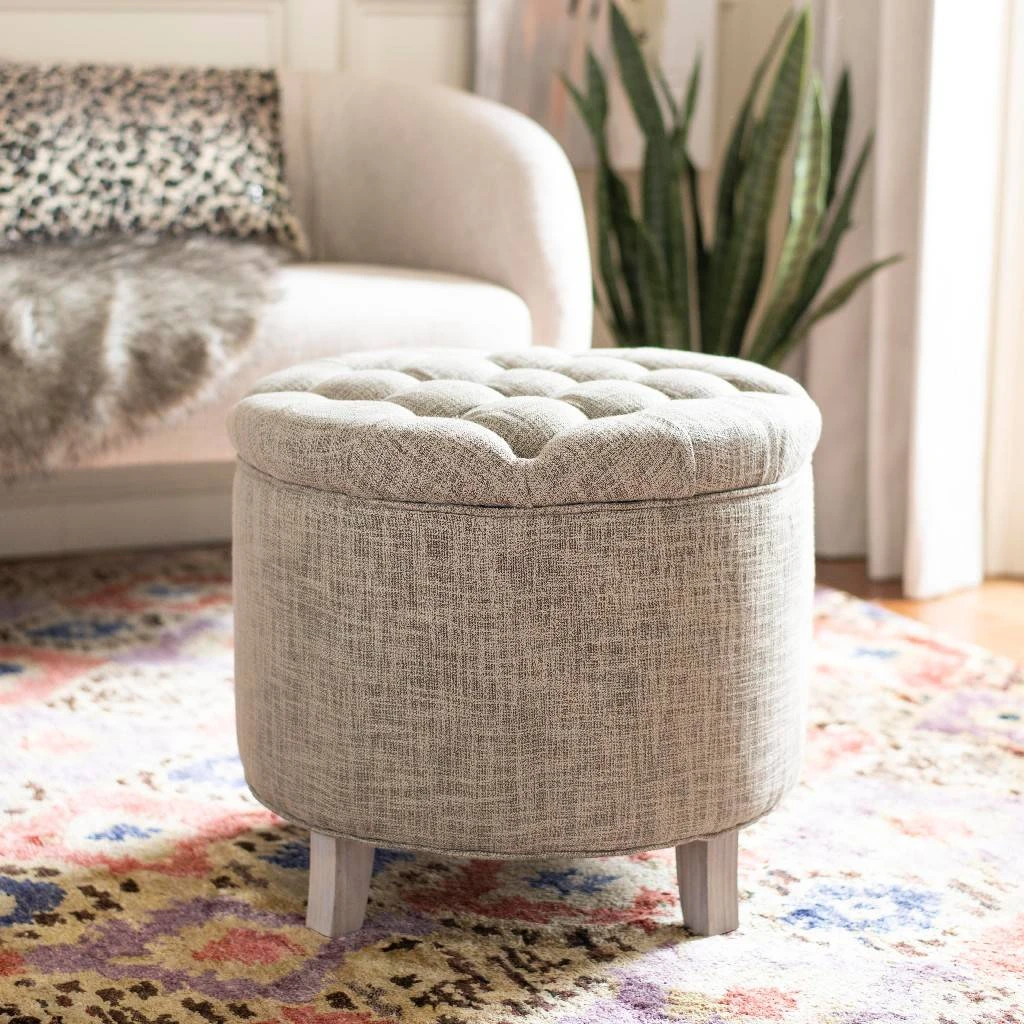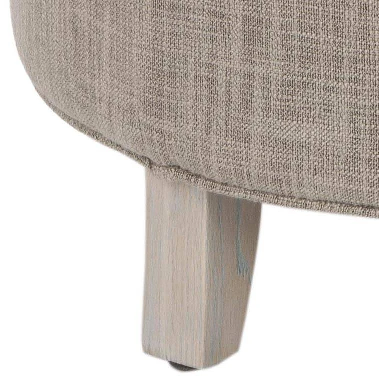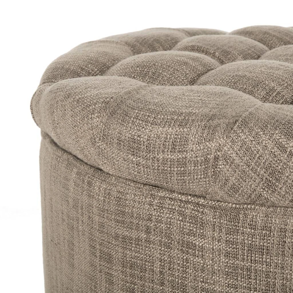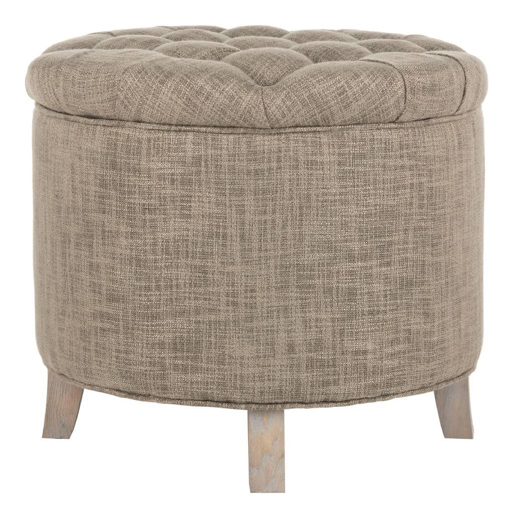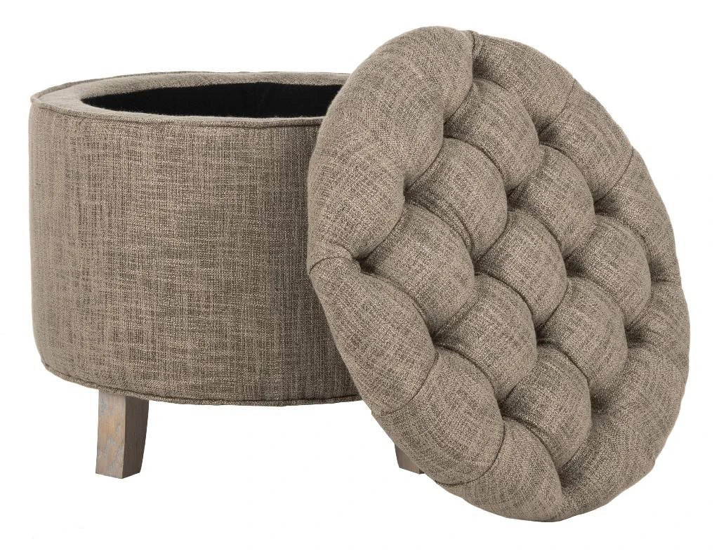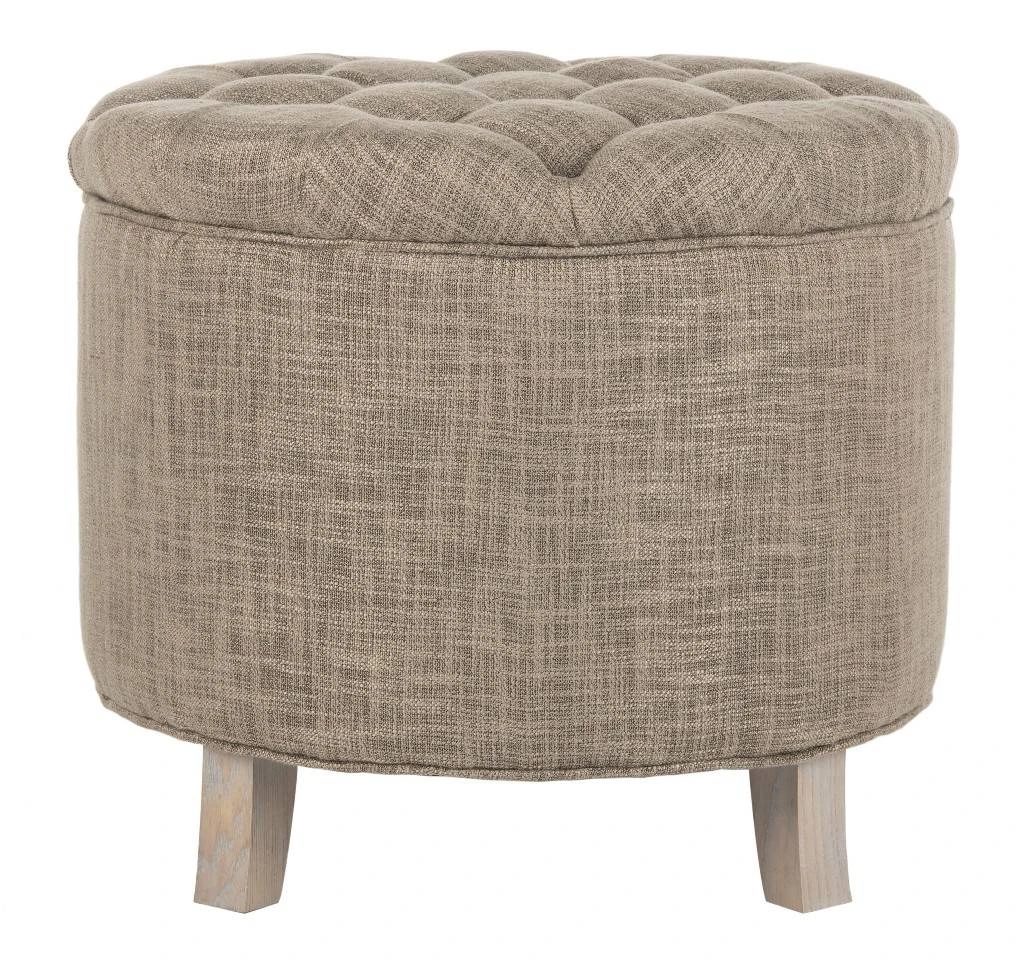 The essential storage ottoman, Amelia is transitional in design with button tufted quilted top and oak legs distressed grey finish. Practical and fashion right, the linen-texture stone fabric is a blend of viscose and polyester.