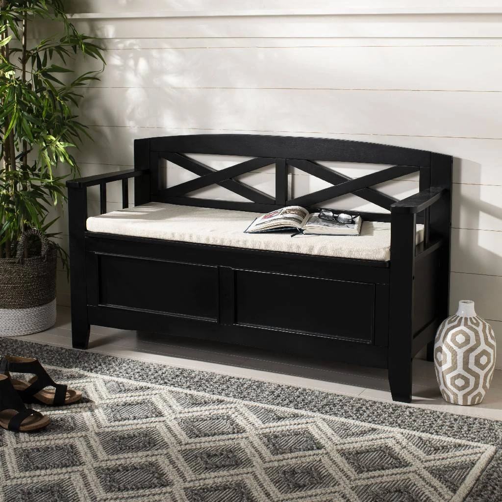 Combining form and function, this contemporary storage bench is a must have organizational piece for the or entry way. Crafted with a black finish and a complementary beige cushion, it’s the perfect addition to any transitional décor. To prevent overall soiling, frequent vacuuming or light brushing is recommended. Cushions and pillows should be turned on a weekly basis. Down-filled cushions should be brushed rather than vacuumed. Spot clean, using a mild water-free solvent or dry cleaning product. Only a professional cleaner should undertake a complete overall cleaning. The use of steam or water-based cleaners may cause excessive shrinking or staining.