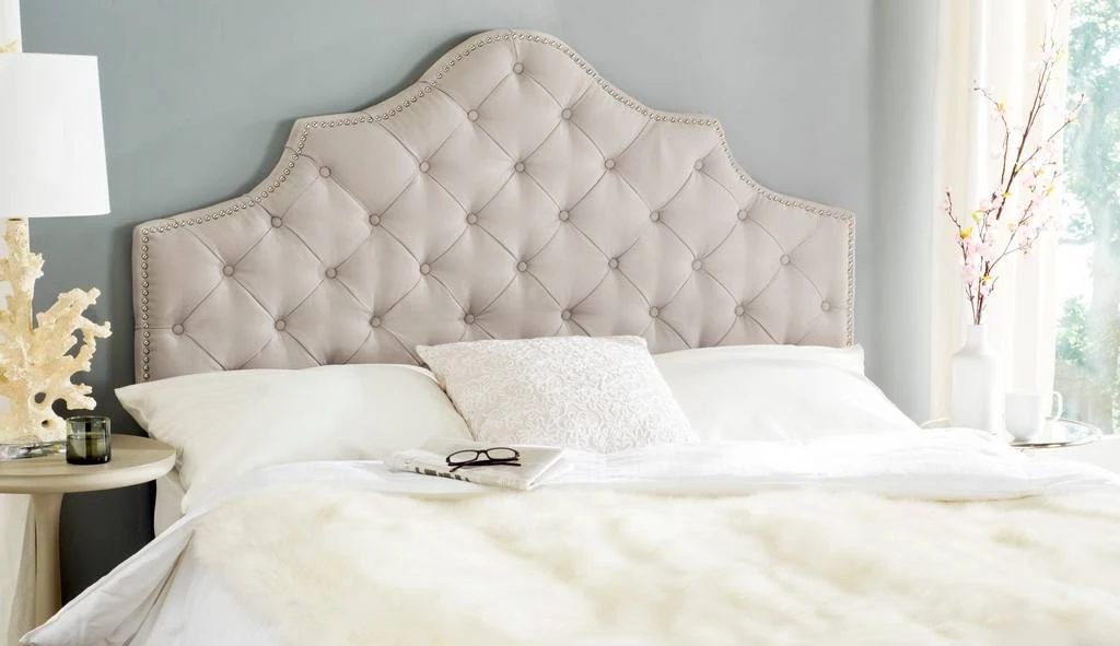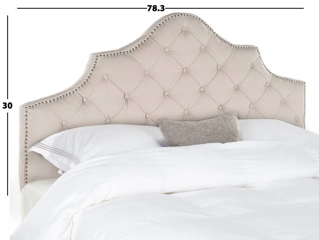 Lavish upholstery and expert tailoring create the aura of old world elegance in the taupe Arebelle tufted headboard. The classic camelback silhouette is outlined with silver nailhead trim accenting richly button tufted natural linen.