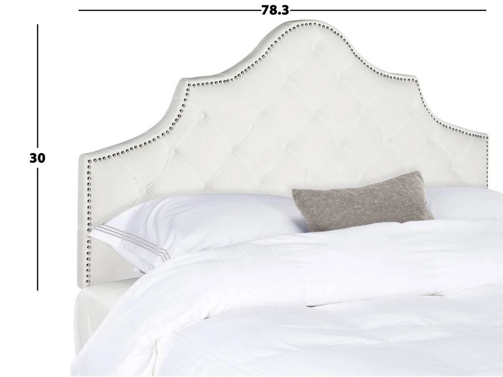 Furnishings that outfit the hotel suite that’s a second home to the residents of Buckingham Palace inspired this tufted velvet headboard. Designed for the boudoir of the modern princess, its white upholstery is adorned with polished nailhead detail.