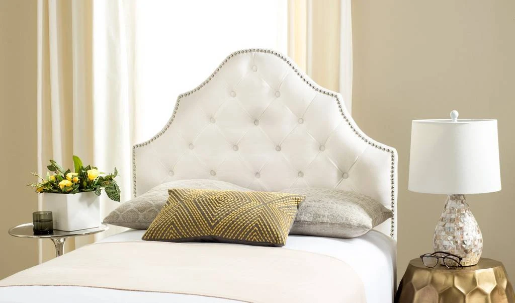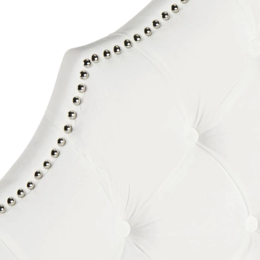 Furnishings that outfit the hotel suite that’s a second home to the residents of Buckingham Palace inspired this tufted velvet headboard. Designed for the boudoir of the modern princess, its white upholstery is adorned with polished nailhead detail.