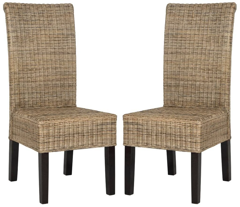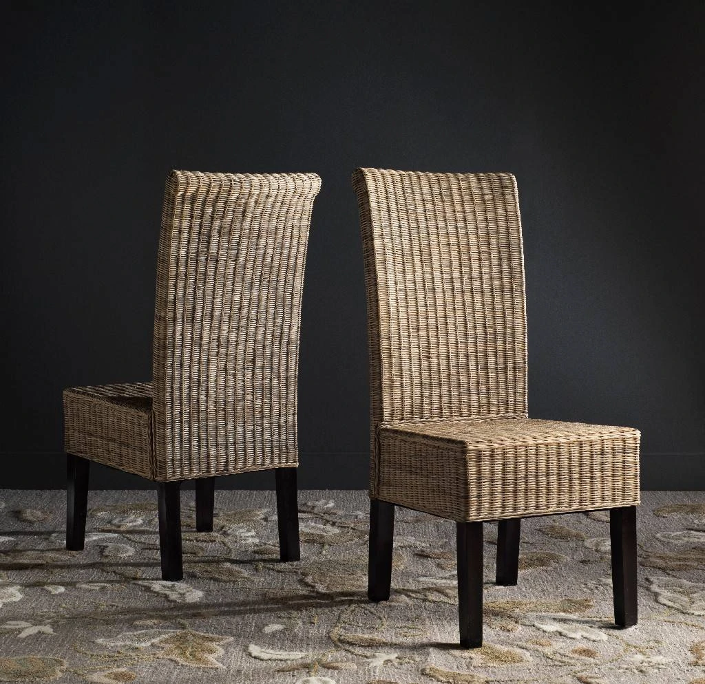 This set of two high back grey rattan dining chairs lends warmth to contemporary and transitional interiors with a dramatic silhouette and contrasting dark hardwood legs. Each beautifully woven rattan chair has natural variations in shading and pattern.