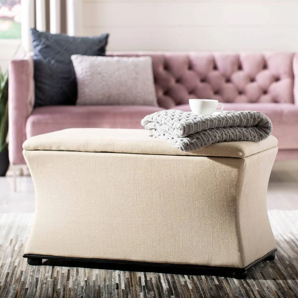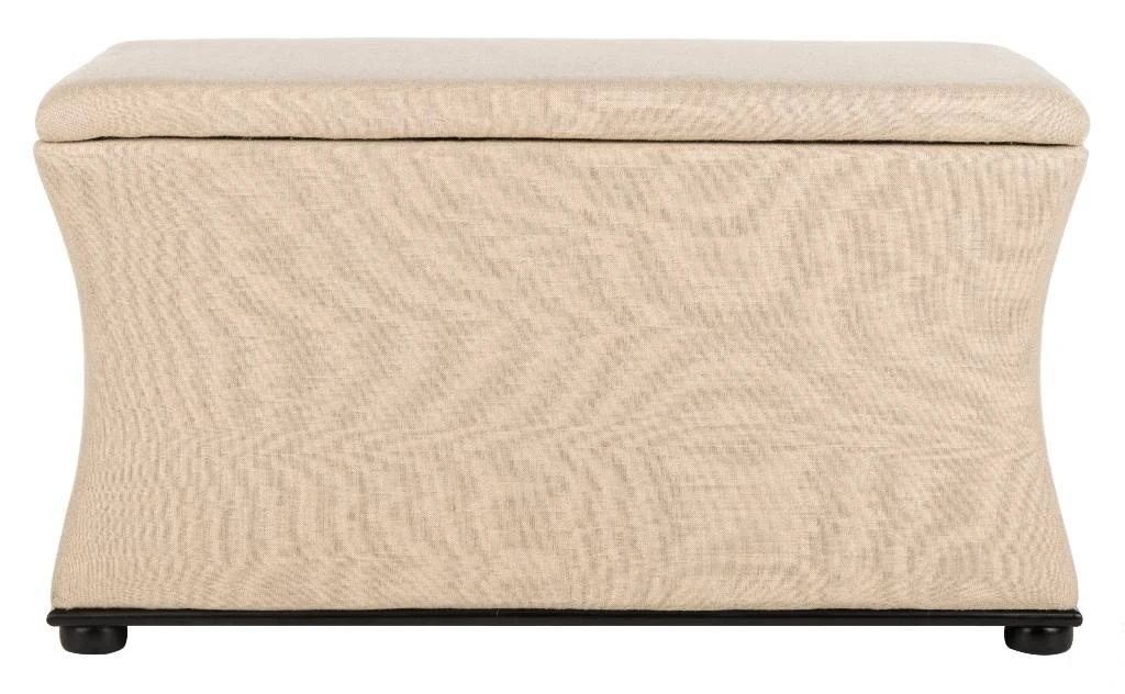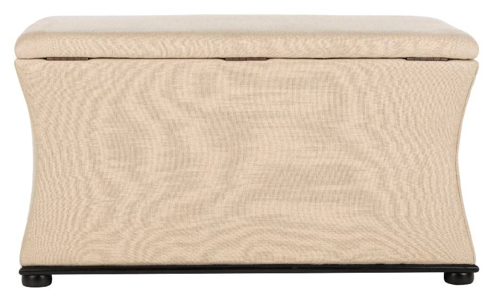 With its seductive silhouette, the Aroura Storage Bench is enveloped in chic, feminine style. Covered in sophisticated beige linen-weave fabric, Aroura sits graciously atop ample black legs sturdy enough to hold everything you stow inside.