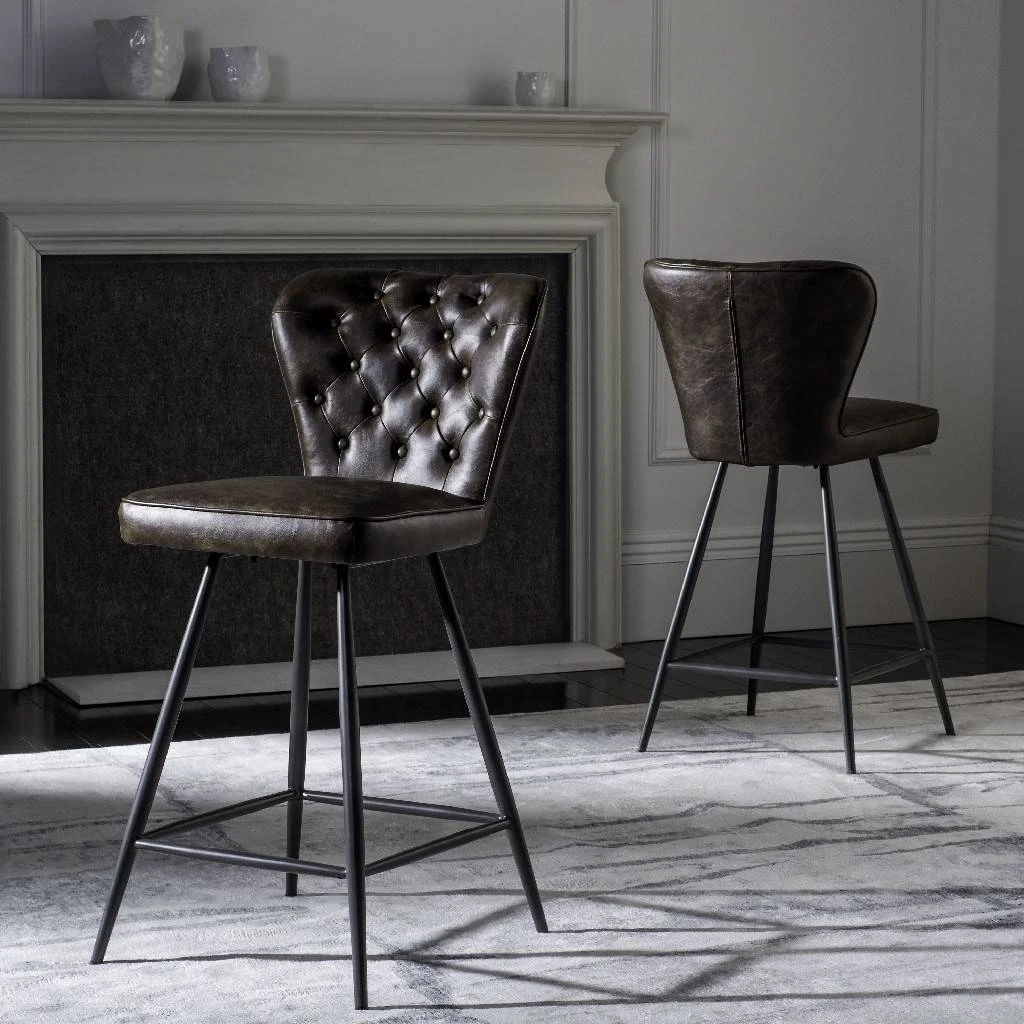 This upscale mid-century counter stool instantly updates any contemporary dining area with vintage curves and sleek metal legs. Designed for the modern jetsetter, its leather-style upholstery with tufted detail brings character and warmth to the table. To maintain use only mild soap and water with a non-abrasive clean cloth
