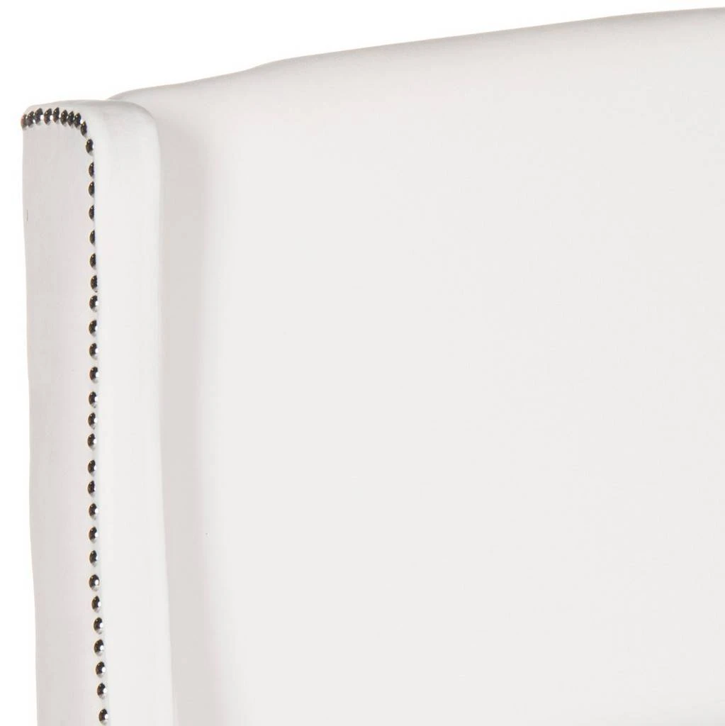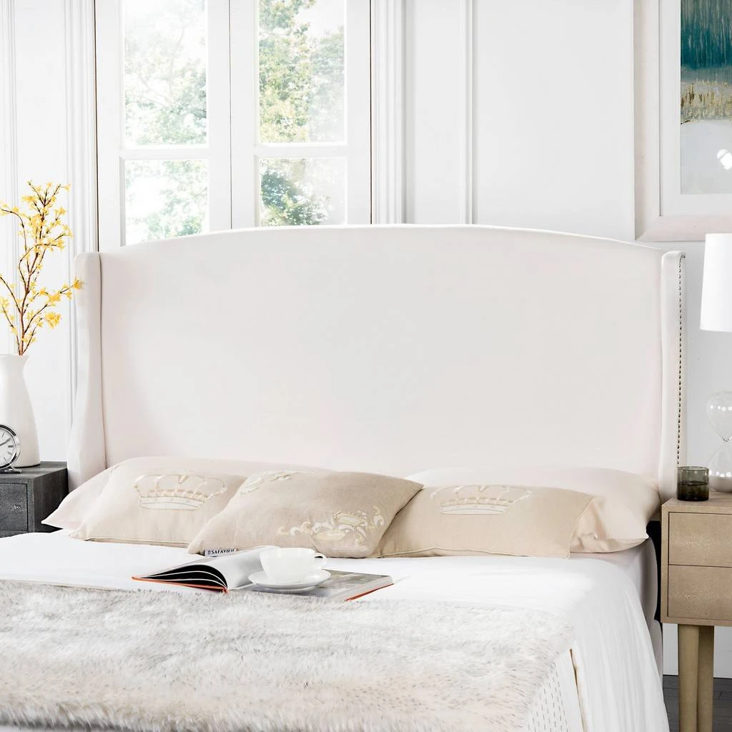 Understated and sophisticated, the Austin headboard in a white velvet fabric is styled for transitional bedrooms. Upholstered with subtle wing sides for indulgent cocooning, its frame is outlined with silver nailhead trim.