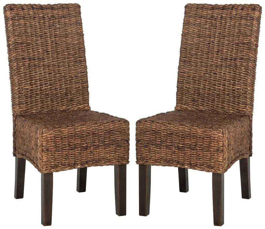 Crafted with exotic banana leaf fiber for its elegant brown coloring and shading, this set of two woven dining chairs is at home in dining rooms, kitchens and casual living spaces. Contrasting dark-finished hardwood legs add to the transitional allure.
