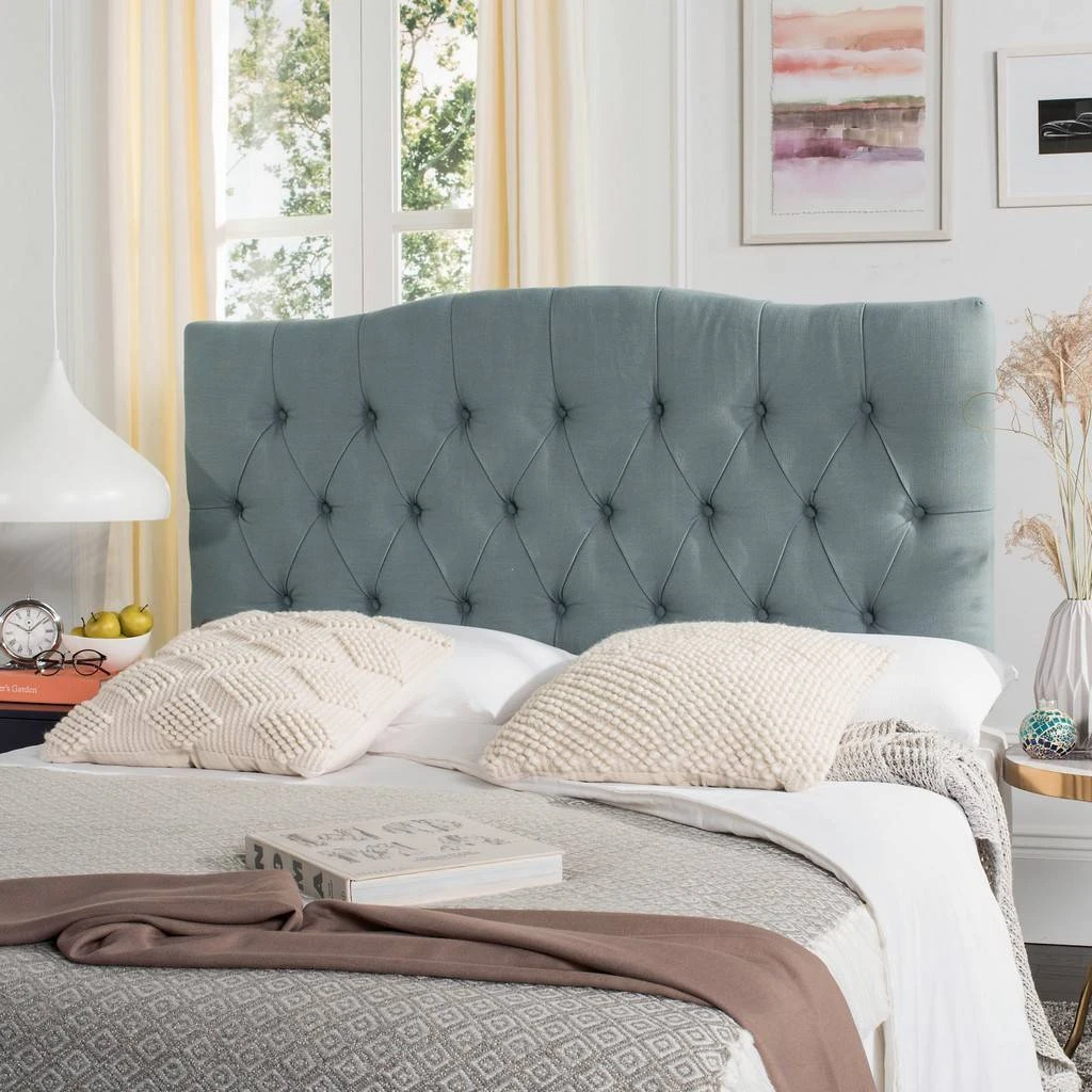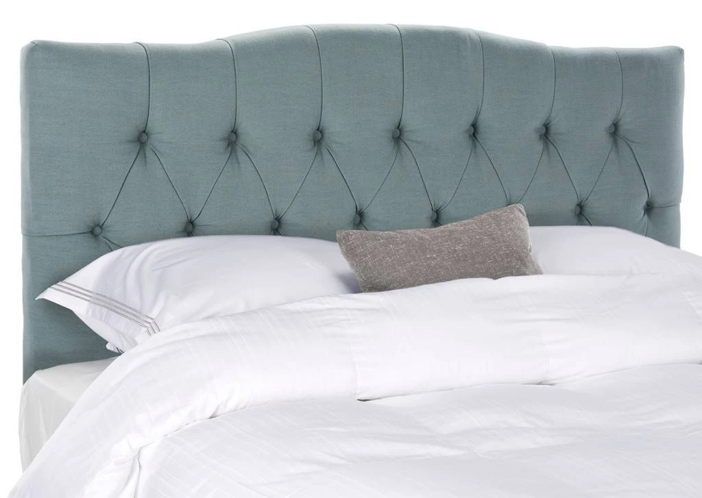 Dress up a guest room or master suite with the deeply tufted Axel sky blue headboard. With posh button tufted upholstery in a linen weave blend this comfortably padded, gently curved headboard evokes images of 1930s Hollywood glam.