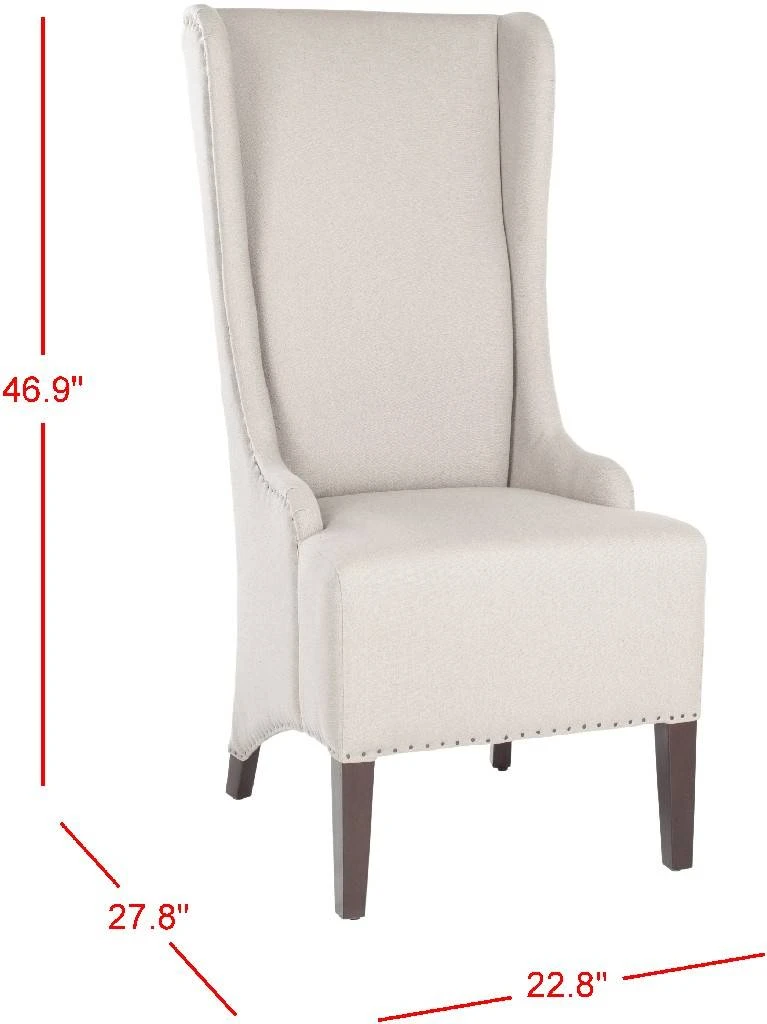 The Bacall high back chair, in taupe linen fabric and cherry mahogany finished legs, absolutely commands attention. With a slightly tapered backrest, black flat nail head trim and sloping arms, the dramatic Bacall is all about smart sophistication. To prevent overall soiling, frequent vacuuming or light brushing is recommended. Cushions and pillows should be turned on a weekly basis. Down-filled cushions should be brushed rather than vacuumed. Spot clean, using a mild water-free solvent or dry cleaning product. Only a professional cleaner should undertake a complete overall cleaning. The use of steam or water-based cleaners may cause excessive shrinking or staining.