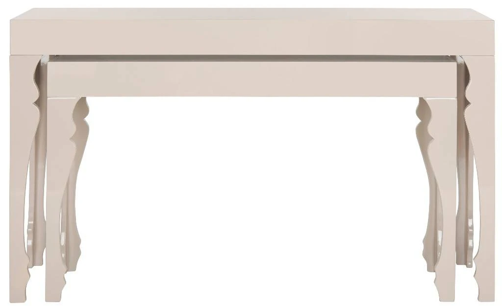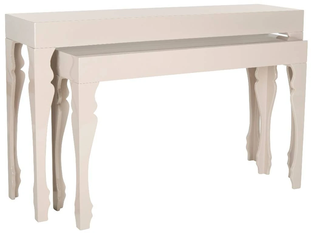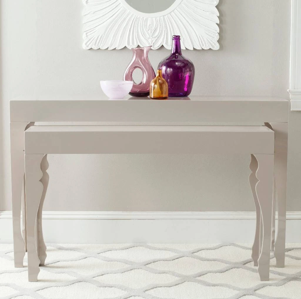 Feminine with a touch of whimsy, this taupe lacquer console adds a glamorous sparkle to any room. Graceful, curlicue legs are derived from Gustavian style furnishings, but this updated finish makes Beth adaptable to traditional and contemporary rooms.