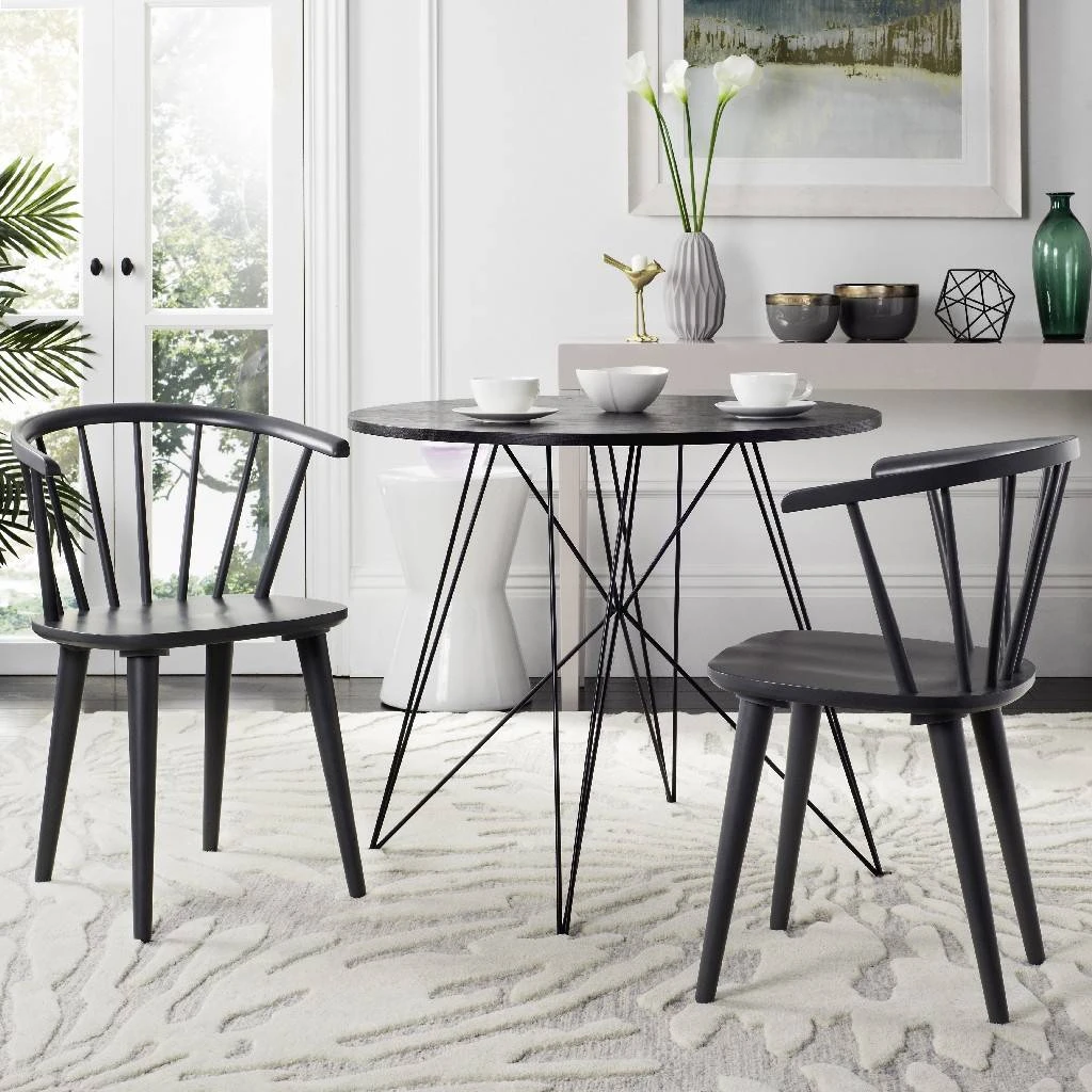 Inspired by the graceful curves of an antique captain’s chair, this set of two dining chairs is crafted of sustainable rubber wood and finished in grey. With backrest spindles and splayed tapered legs, it brings transitional style to a colonial classic. Wood is a natural material with variations of color shade, configuration, streaks, and grain structure. Each individual piece of Safavieh furniture has characteristic markings that will differ from photo and showroom samples. Regular attention and maintenance of fine furniture can ensure its beauty for years to come. Always use felt pads under all articles to prevent discoloration or softening of the lacquer. Plastic and rubber bases on items can discolor wood.