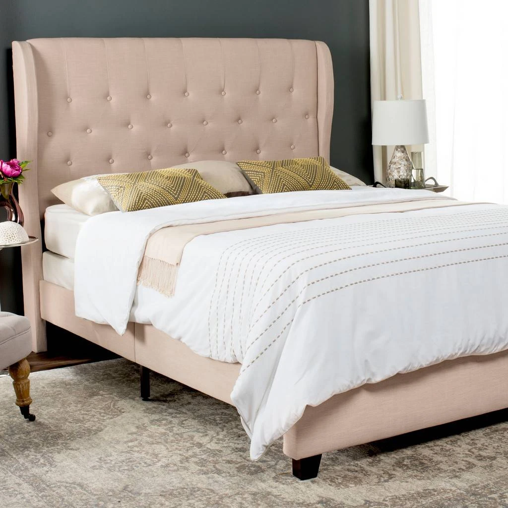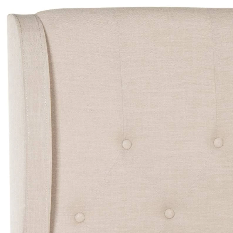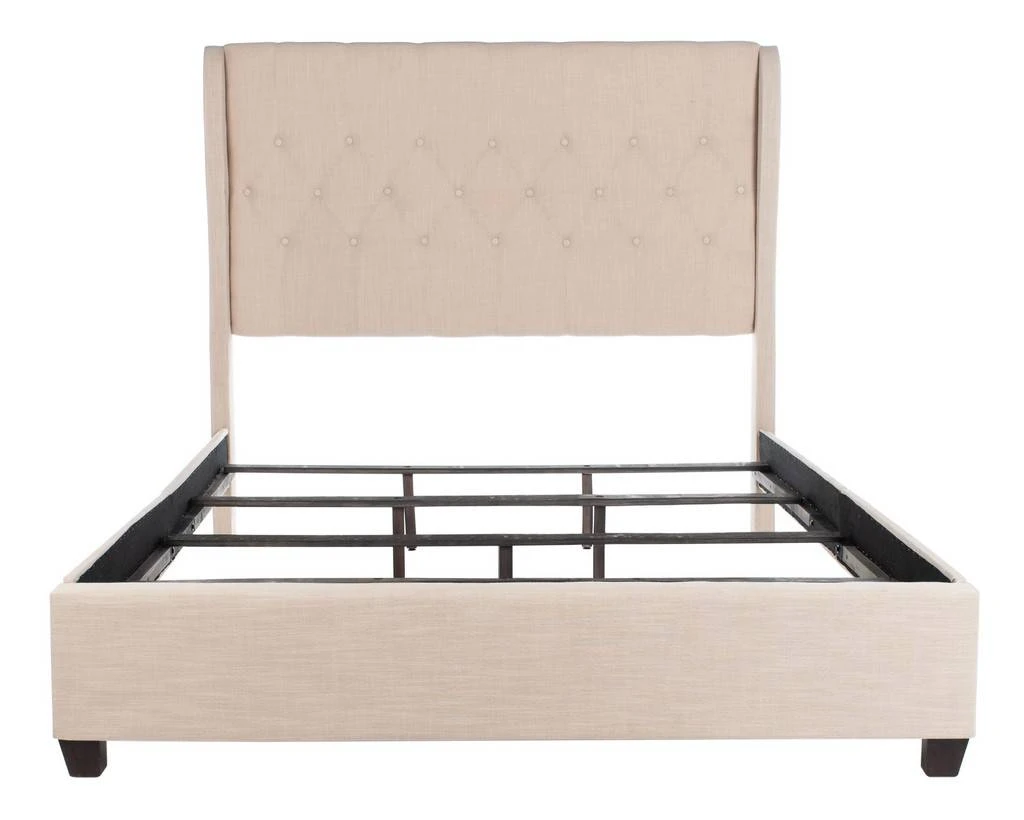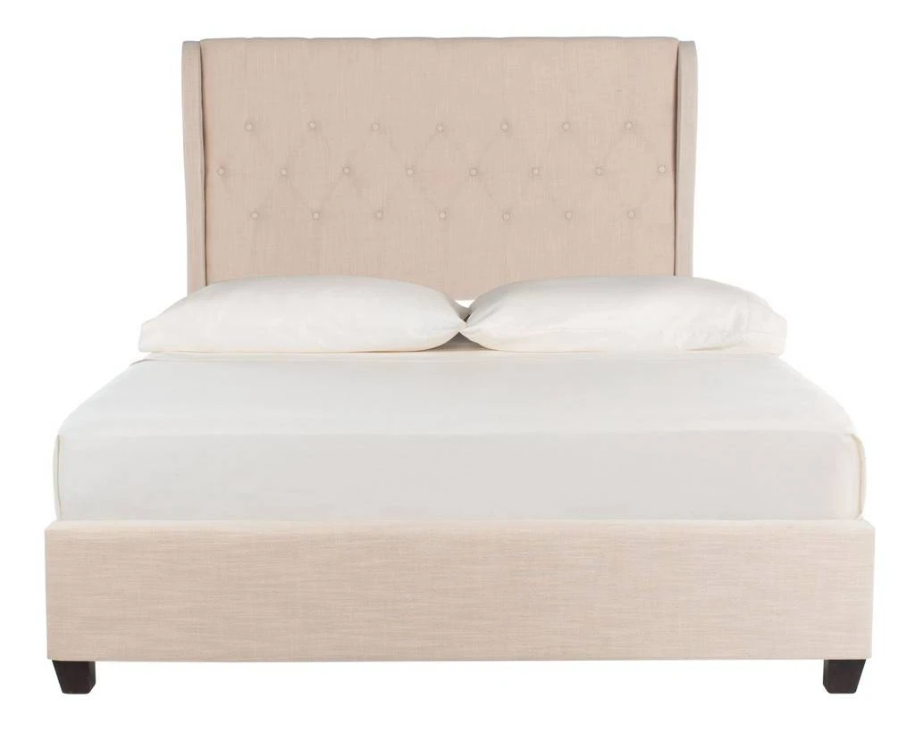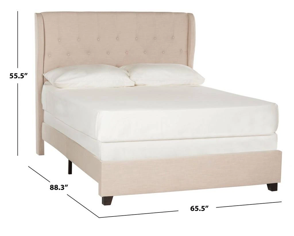 Indulge in the luxury of a fully upholstered twin size bed with all the elegant touches of a custom design. Light beige pure linen covers everything from a button tufted headboard with enveloping wing arms to its footboard with espresso rubber wood legs.