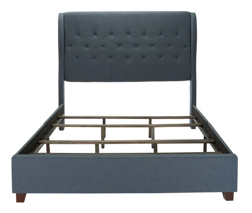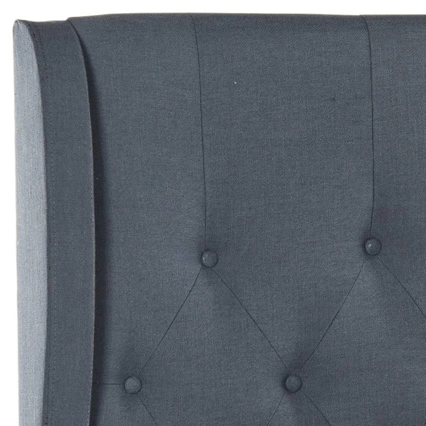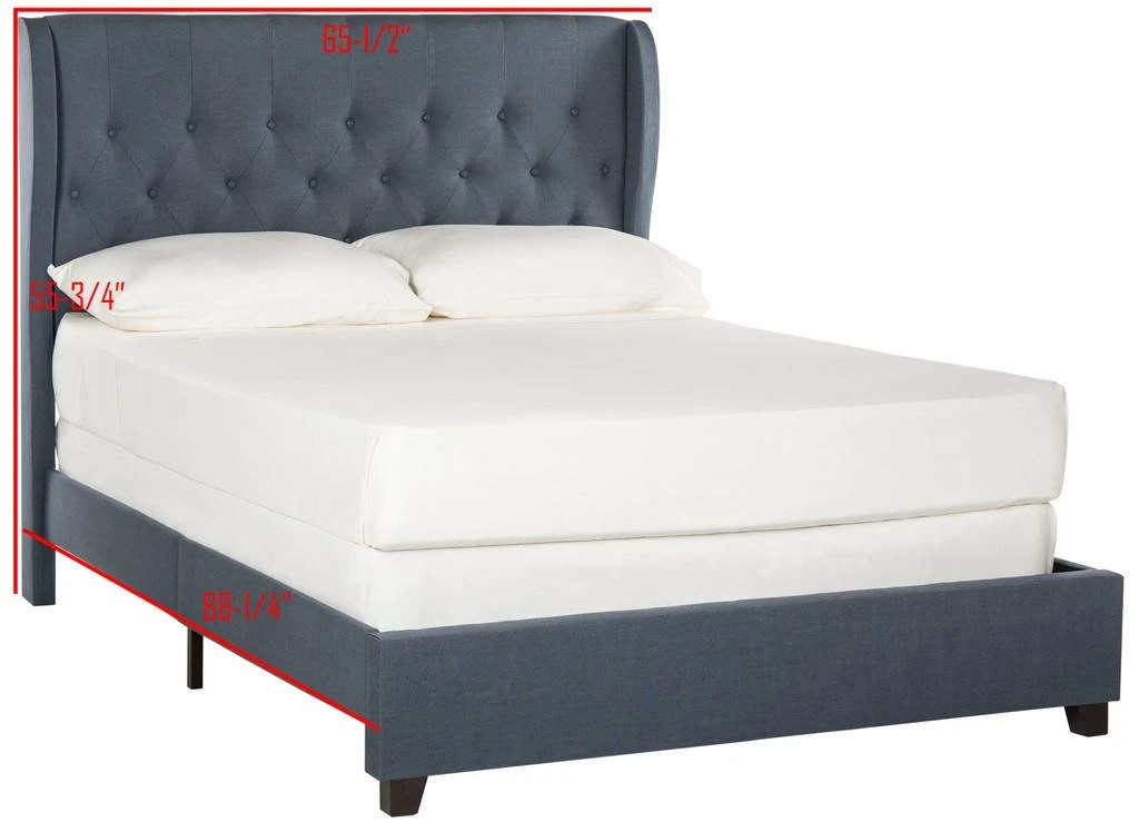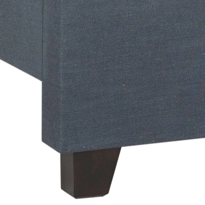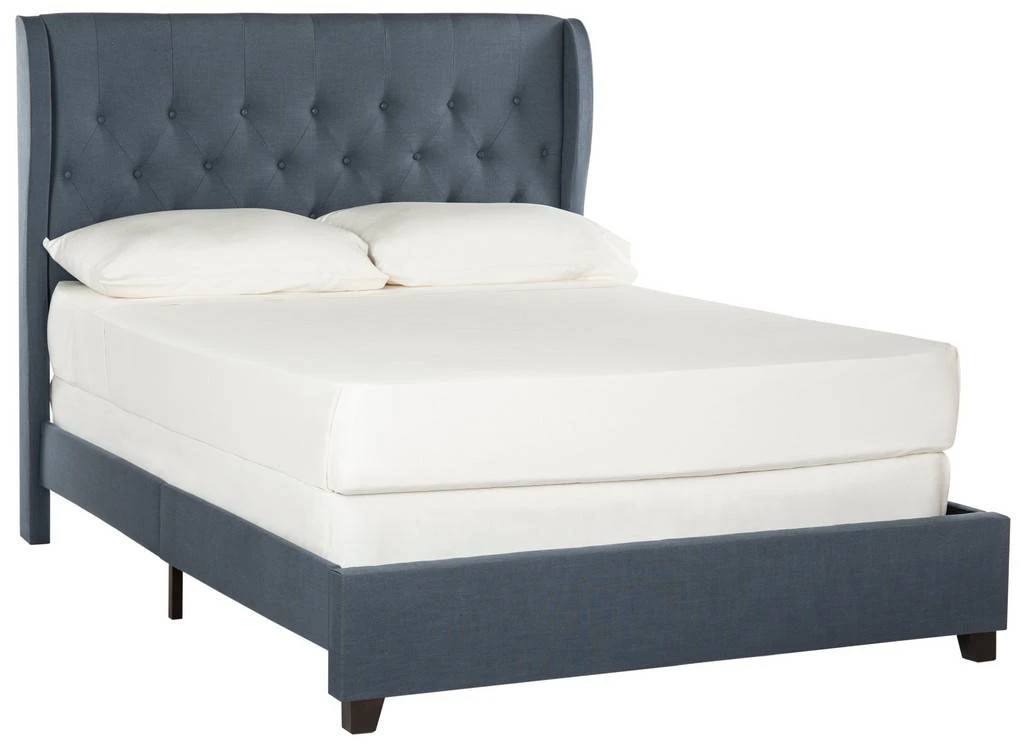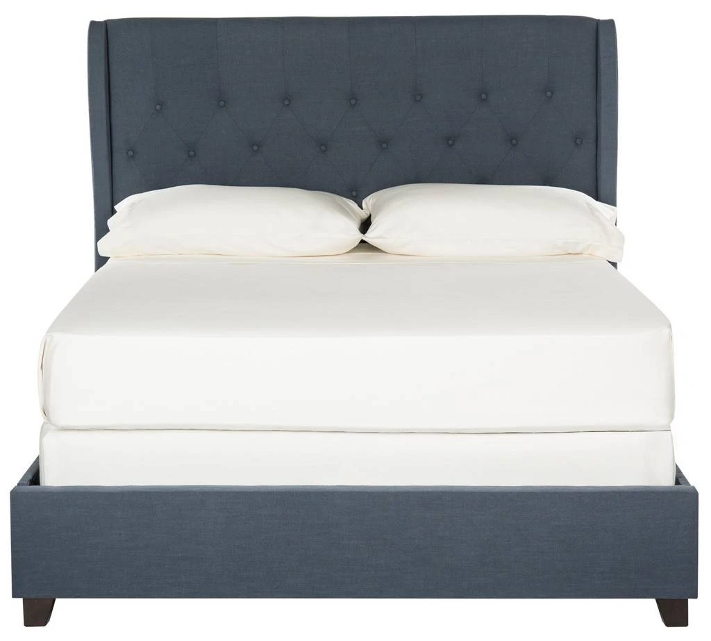 Indulge in the luxury of a fully upholstered size bed with all the elegant touches of a custom design. Navy blue pure linen covers everything from a button tufted headboard with enveloping wing arms to its footboard with espresso rubber wood legs.