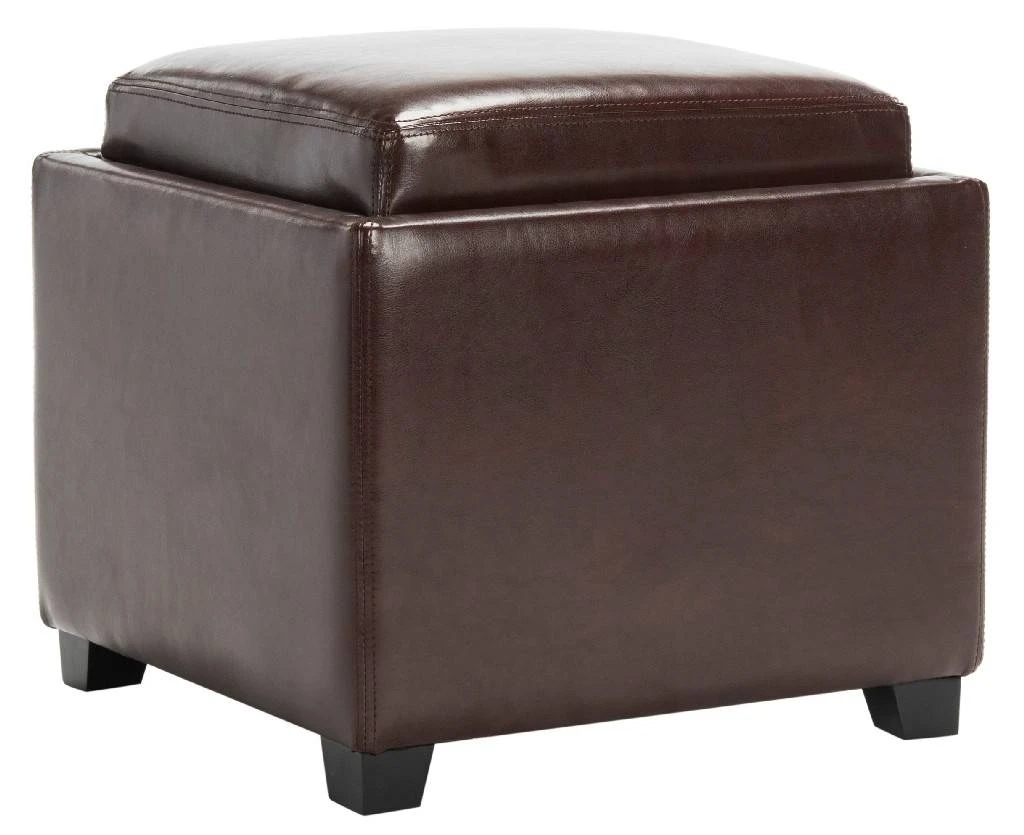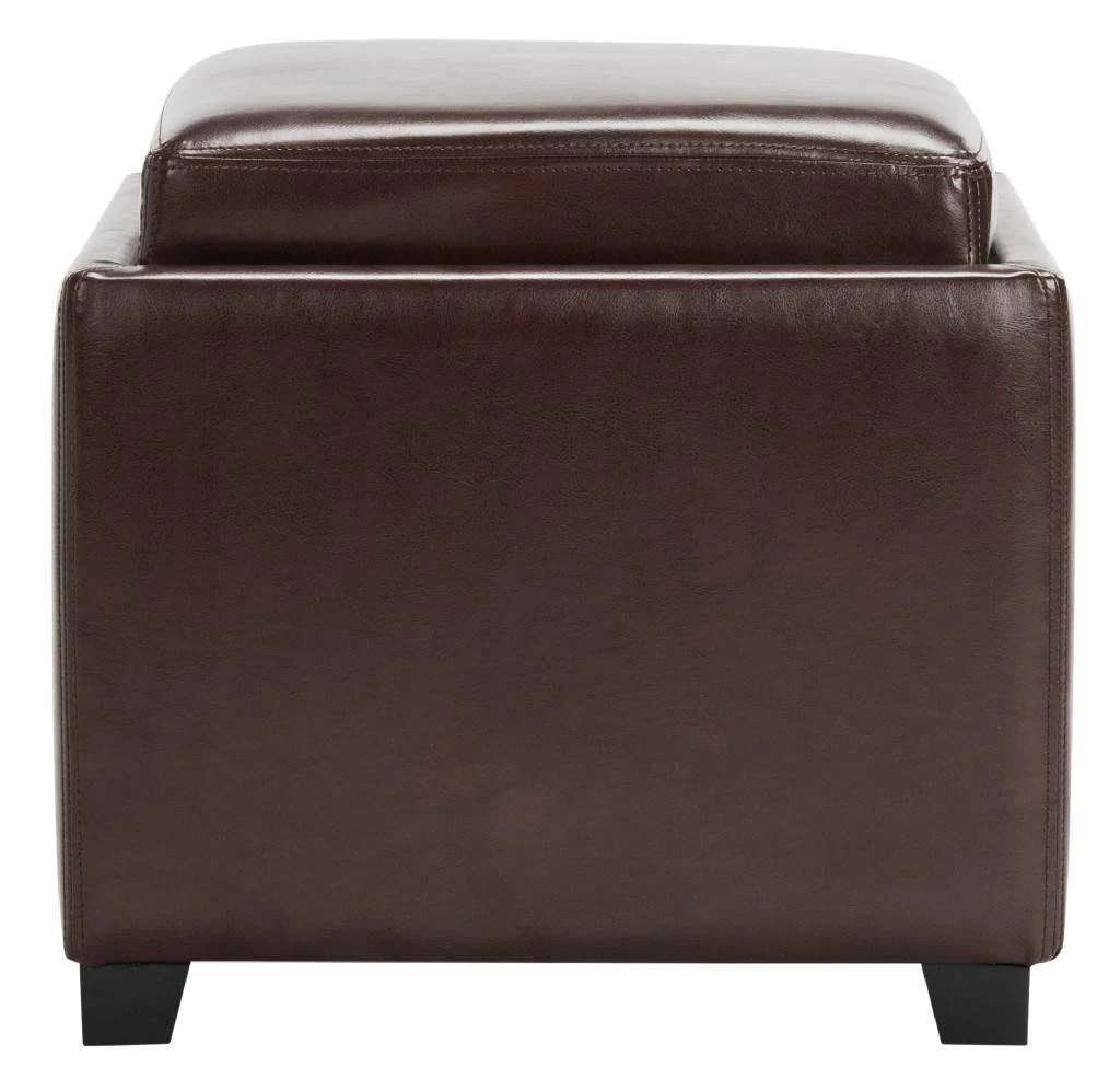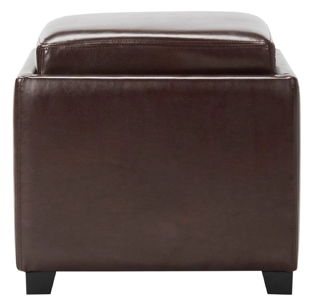 Relax and unwind. The Bobbi Tray Storage Ottoman will be the most efficient member of your family. Sturdy beech wood legs in Java finish make it a heavy-hitter and its smooth cushion top offers extra seating, as well as a tray perfect for a glass of wine after a long day. Upholstered in cordovan bicast leather, Bobbi store blankets, magazines or those bits of technology that interrupt an interior’s aesthetic.