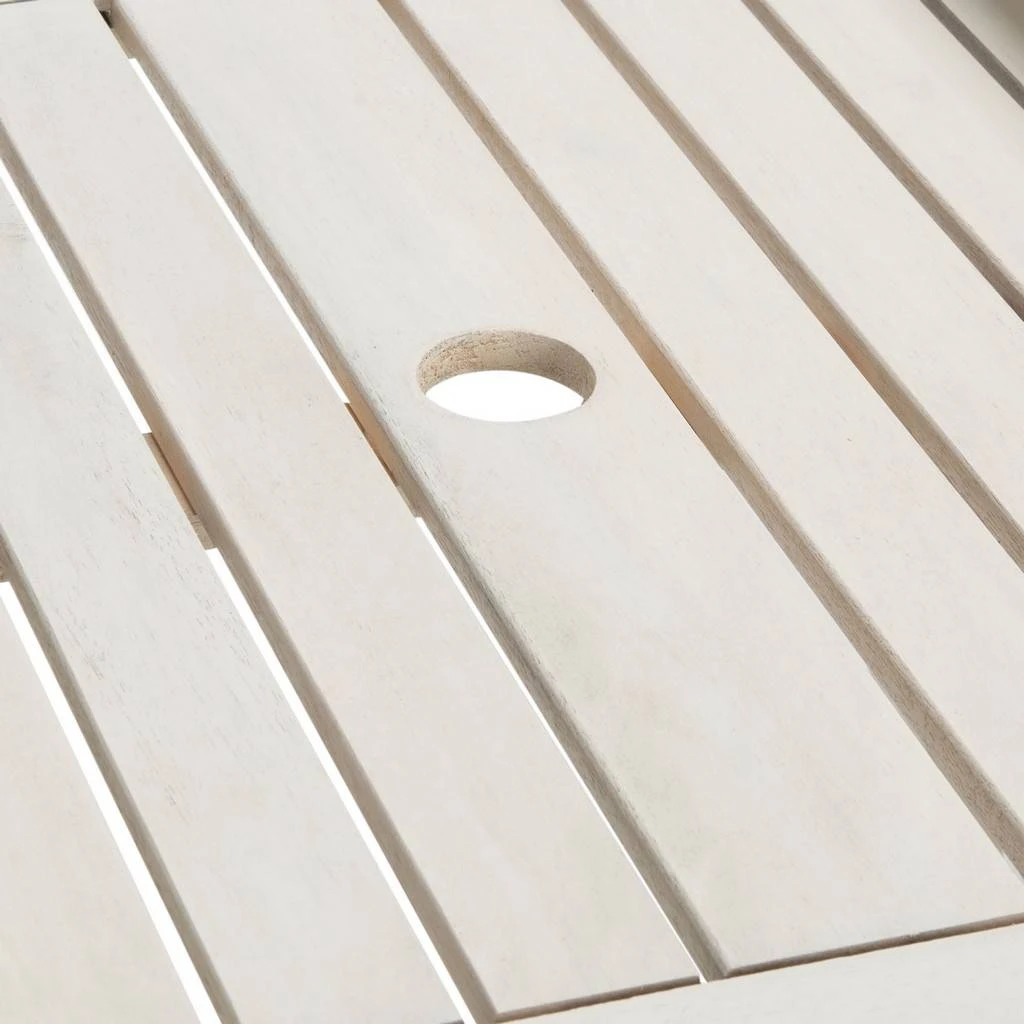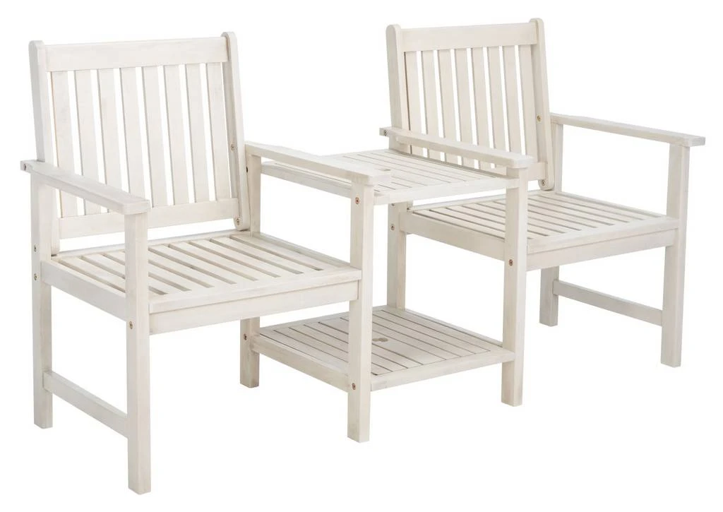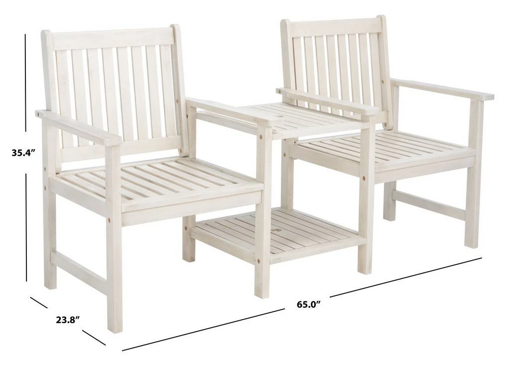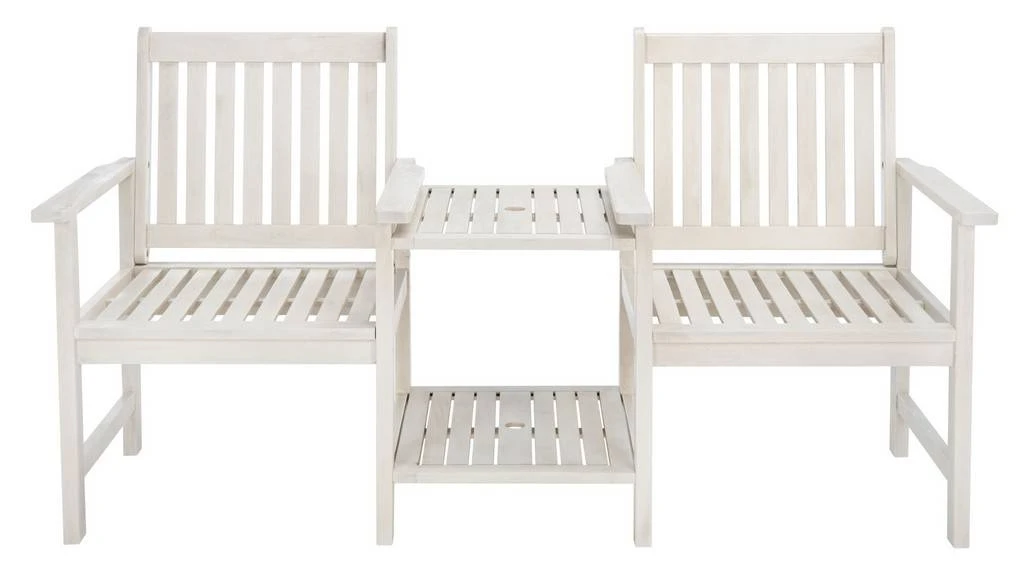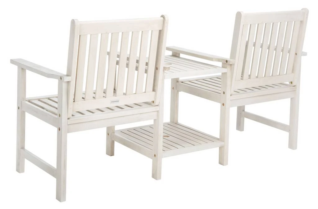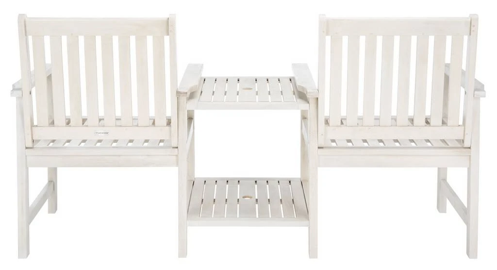 An eco friendly conversation piece, this twin seat bench is recalls hand hewn Shaker furniture, but for outdoor use on the porch or patio. Â Crafted of sustainable acacia wood in grey, it comes with its own umbrella ready drink table.