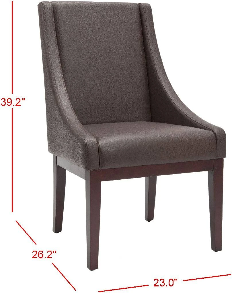 The simplicity of lines and gently sloping arms of the brown leather upholstered Sloping chair, with legs in dark cherry finish, prove an elegant combination. Slope can dress up casual country dining rooms, add class to classic settings and even rest at ease in contemporary homes. Although Leather is one of the most durable upholstery materials, proper care is vital to maintain its appearance and performance. Dust weekly using a soft, clean cloth slightly dampened with distilled water. Blot spills immediately with a soft, clean absorbent dry cloth.