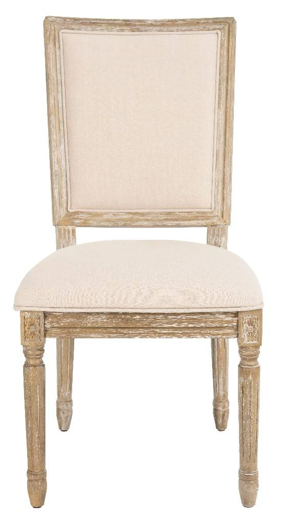 Old world elegance meets modern-day comfort in this set of two French side chairs with artfully carved frames finished in rustic oak. Chic beige linen covers their classic rectangular backs and plush seats for timeless beauty and great dining room style. To prevent overall soiling, frequent vacuuming or light brushing is recommended. Cushions and pillows should be turned on a weekly basis. Down-filled cushions should be brushed rather than vacuumed. Spot clean, using a mild water-free solvent or dry cleaning product. Only a professional cleaner should undertake a complete overall cleaning. The use of steam or water-based cleaners may cause excessive shrinking or staining.