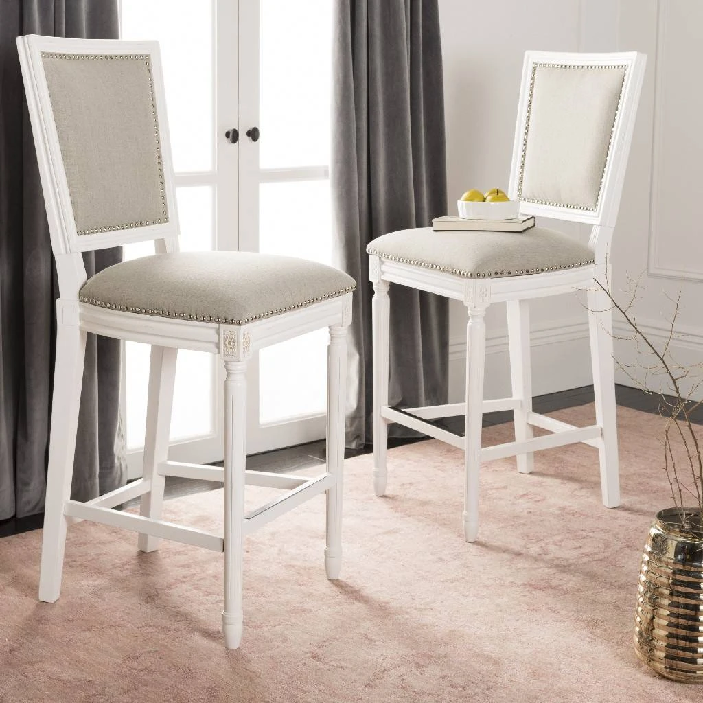 Entertain in style with this rectangle bar stool. Designed to bring French charm to the table, its chic light grey upholstery is paired with finely carved distressed white wood. Designers use it to add instant character to any dining area or breakfast bar.