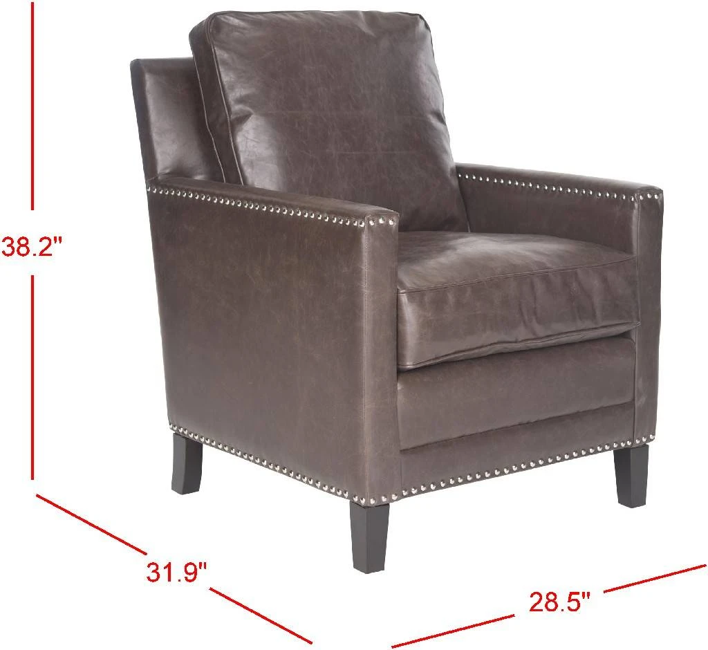 The Buckler club chair updates a familiar form for relaxed transitional interiors. Masculine, but not heavy with silver nail heads along the armrest and base, Buckler pairs loose cushions with antique brown PU leather. Sturdy legs crafted from birch wood are finished in espresso. Although Leather is one of the most durable upholstery materials, proper care is vital to maintain its appearance and performance. Dust weekly using a soft, clean cloth slightly dampened with distilled water. Blot spills immediately with a soft, clean absorbent dry cloth.