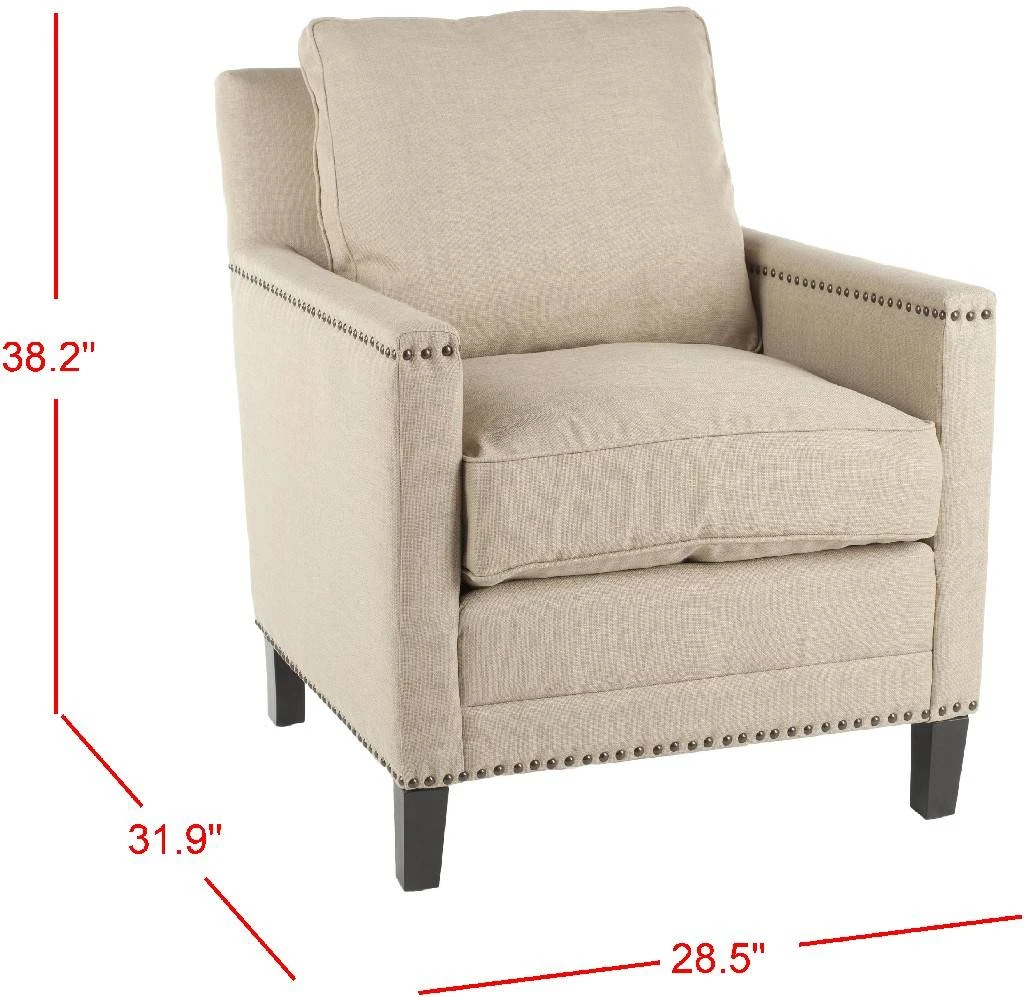 The Buckler club chair takes a familiar form and tweaks it. Masculine, but not heavy, brass nail heads along the armrest and base are paired with loose cushions and beige cotton blend fabric. Sturdy legs crafted from birch wood are finished in espresso. To prevent overall soiling, frequent vacuuming or light brushing is recommended. Cushions and pillows should be turned on a weekly basis. Down-filled cushions should be brushed rather than vacuumed. Spot clean, using a mild water-free solvent or dry cleaning product. Only a professional cleaner should undertake a complete overall cleaning. The use of steam or water-based cleaners may cause excessive shrinking or staining.
