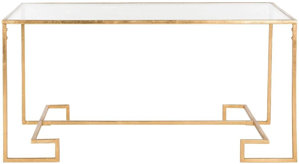 A sophisticated coffee table discriminating tastes, this strikingly simple piece is artisan forced of iron, and then finished with a lustrous antique gold leaf that lights up a room in style. A practical glass top makes even more reflective beauty.