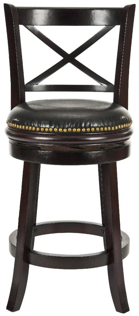 The Butler Swivel Counter Stool gives traditional styling an update with a crisscross back and gently curved legs of Malaysian Oak with a rich cappuccino finish. The well-padded swivel seat’s cushion is covered in black bi-cast leather and accented with nail head detailing. With a 24-inch seat height, Butler will be perfect for your counter or pub table. Assembly required.