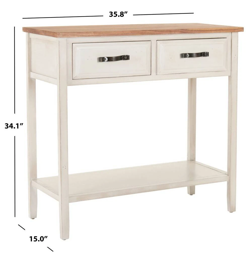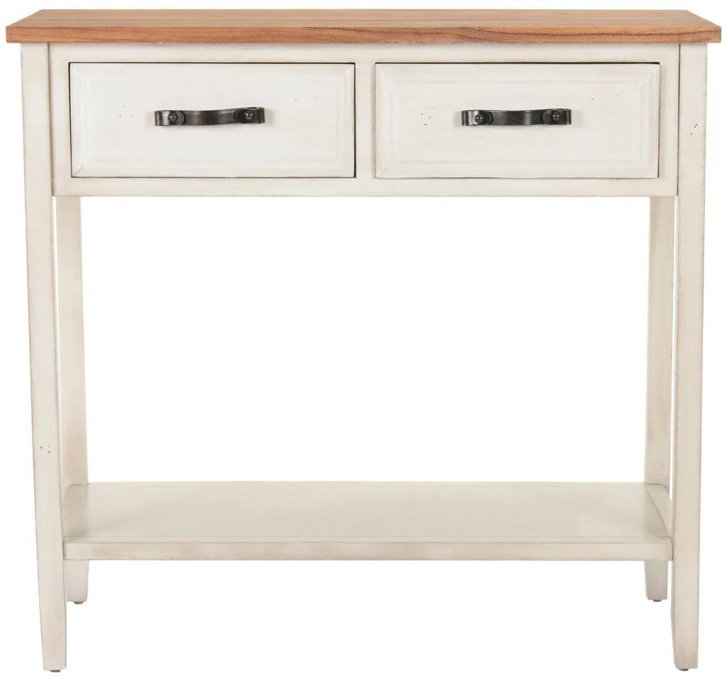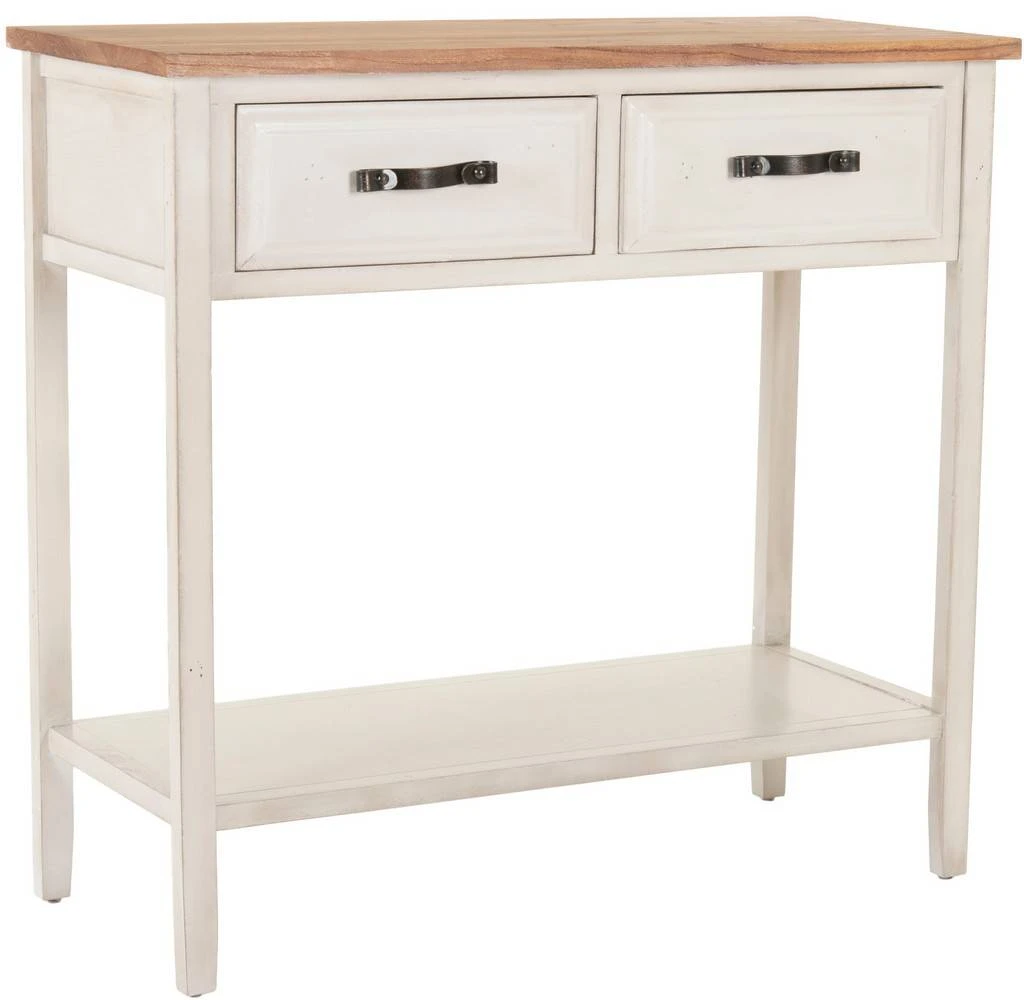 The Carol Console, composed of elm and poplar wood, speaks a country casual language perfect for welcoming spaces. A natural wood top perched on white birch finished drawers and frame is ideal in kitchens, foyers, or living rooms.