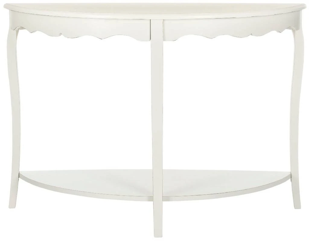 It’s a learning curve. Combining the tradition of the half-moon style table with a gentle, romantic touch, the Christina Console updates a hallway or entryway with its off white palette. Crafted of poplar wood with scalloped apron and lower shelf, it’s a wise addition to any décor.