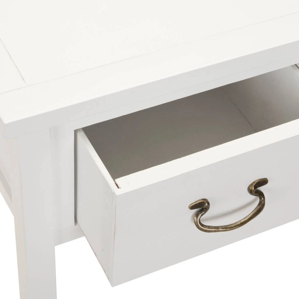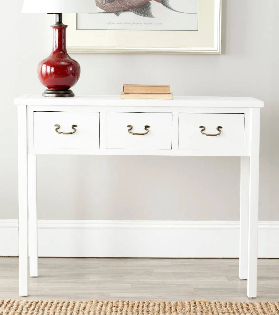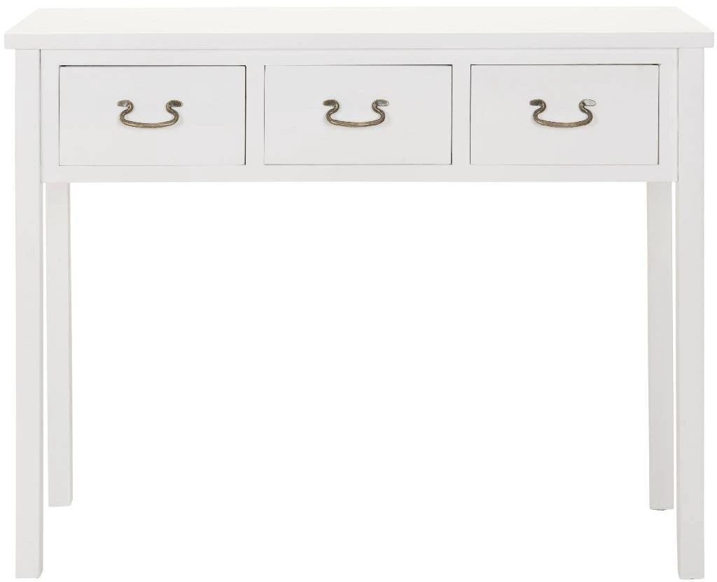 The Cindy console, with slightly tapered legs, just right white finish and three drawers for stashing, has a basic, easy-going appeal. Perfect for country, beachy or casual settings, the console is crafted from poplar wood. Minor assembly required.