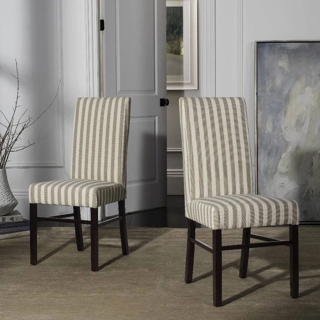 Safavieh’s Classic side chair has a timeless appeal that won’t fade with fads. Characterized by clean lines and well-balanced proportions, Classic, shown in cream-and-tan striped cotton fabric and cherry mahogany finished legs, is at home in traditional and transitional settings. To prevent overall soiling, frequent vacuuming or light brushing is recommended. Cushions and pillows should be turned on a weekly basis. Down-filled cushions should be brushed rather than vacuumed. Spot clean, using a mild water-free solvent or dry cleaning product. Only a professional cleaner should undertake a complete overall cleaning. The use of steam or water-based cleaners may cause excessive shrinking or staining.