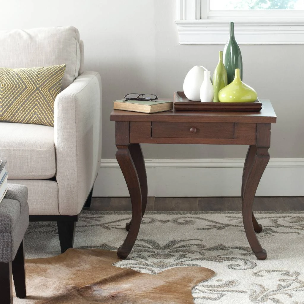 Pretty and petite, the Colman side table is the ideal accent in transitional or country interiors. With its single drawer and updated cabriole legs, this rich brown fire wood table works equally well beside a sofa, chair or on either side of a bed. Wood is a natural material with variations of color shade, configuration, streaks, and grain structure. Each individual piece of Safavieh furniture has characteristic markings that will differ from photo and showroom samples. Regular attention and maintenance of fine furniture can ensure its beauty for years to come. Always use felt pads under all articles to prevent discoloration or softening of the lacquer. Plastic and rubber bases on items can discolor wood.