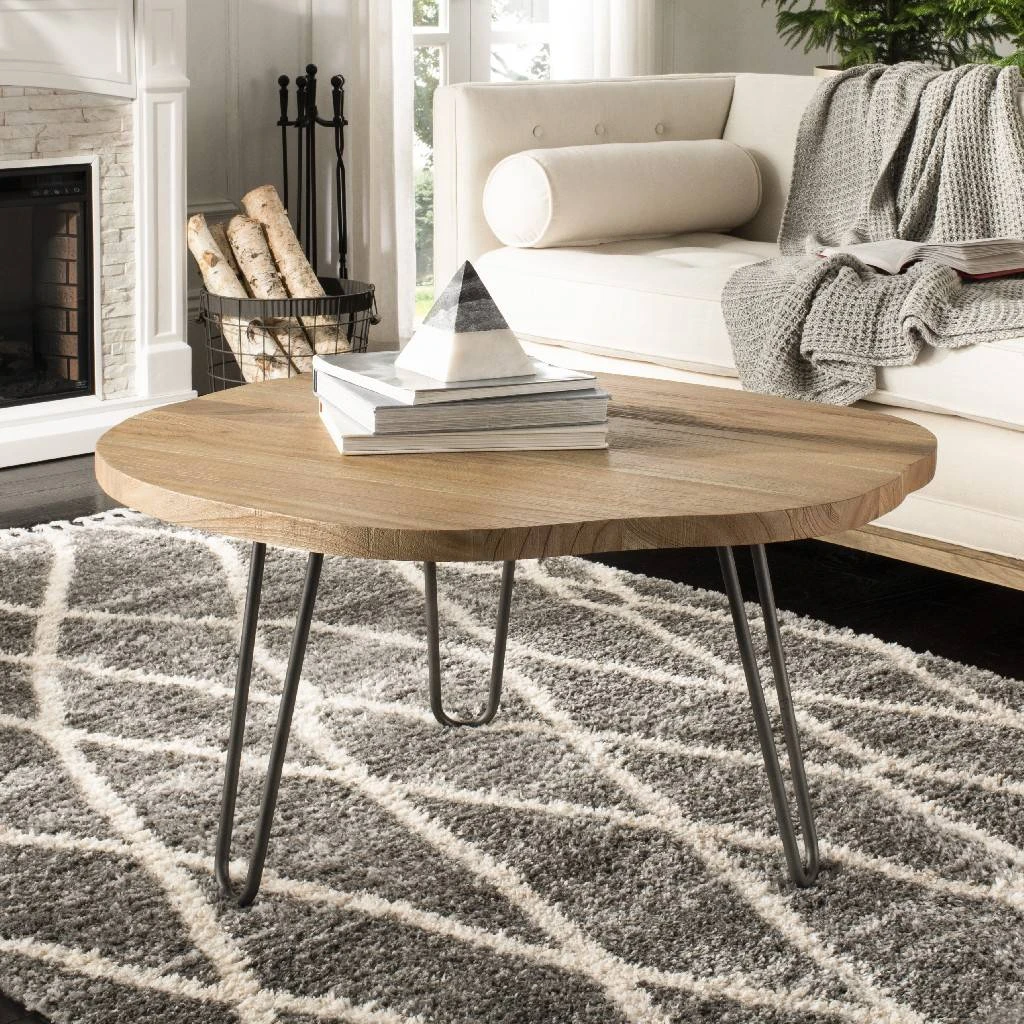 Designed to highlight its rugged natural beauty, this contemporary free edge coffee table will be an instant focal point in any . Rich in character, its weathered oak finish and dark steel hairpin legs blend retro details with cozy, warm style. To maintain use only mild soap and water with a non-abrasive clean cloth
