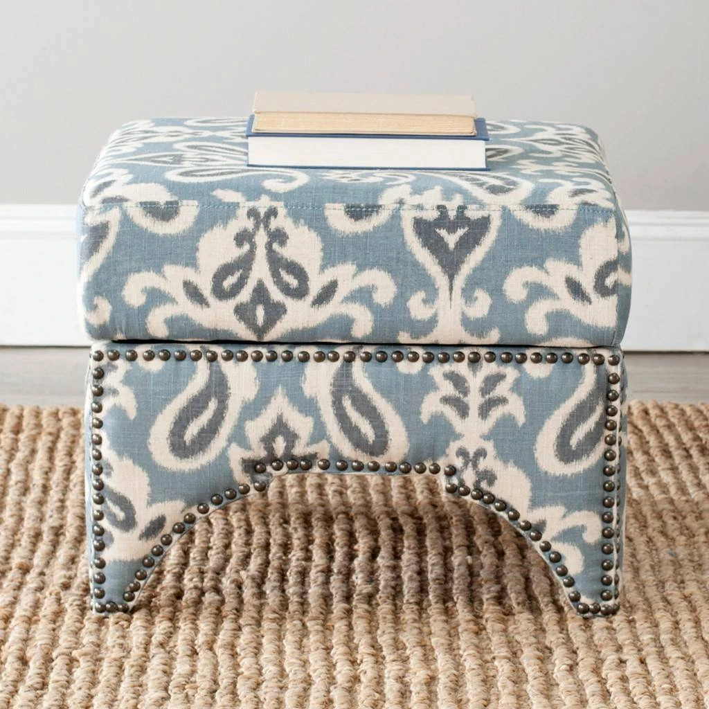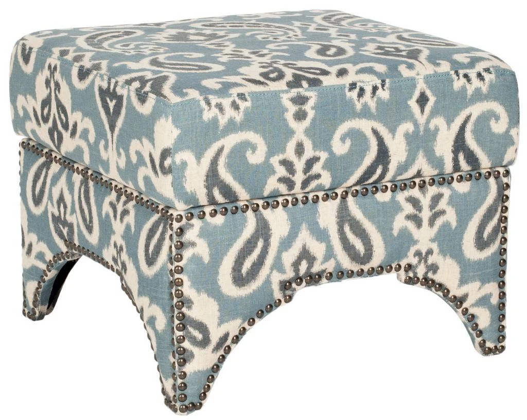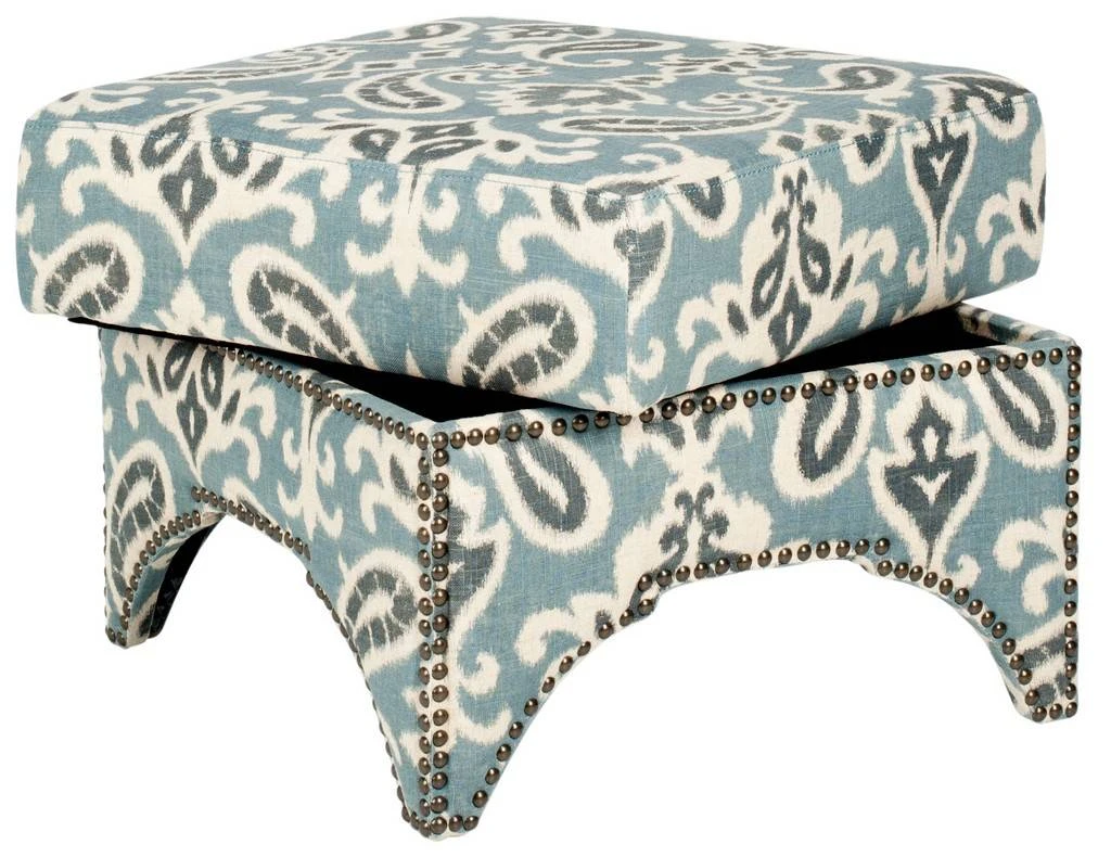The Declan Ottoman seamlessly bridges Eastern and Western design influences with its cutout motif inspired by Moroccan architecture. Beautifully upholstered in a cornflower blue paisley cotton linen fabric and accented by brass nail head trim, Declan is as stylish as it is comfortable.