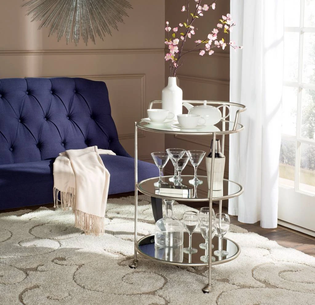 Designed for the “hostess with the most ess”, the sleek Dulcinea Bar Cart is the perfect solution to elegant service in small spaces. With mirrored glass shelves, chic steering handle, and versatile casters, Dulcinea is crafted of sturdy iron in a lustrous silver finish.