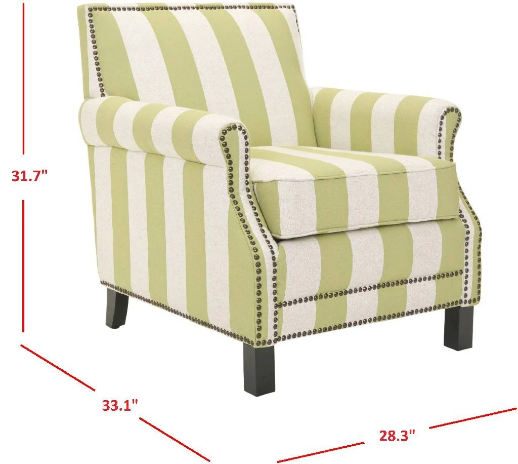 The distinguished Easton chair, with slender frame, roll arms and brass nail head details, is a fireside classic revved up with green and cream awning stripe poly-linen fabric. Standing on birch legs with an espresso finish, this comfy club chair is an easy-going version of a den and library favorite. Designed for small spaces, the transitional Easton chair adapts to traditional, country and soft contemporary settings with ease. To prevent overall soiling, frequent vacuuming or light brushing is recommended. Cushions and pillows should be turned on a weekly basis. Down-filled cushions should be brushed rather than vacuumed. Spot clean, using a mild water-free solvent or dry cleaning product. Only a professional cleaner should undertake a complete overall cleaning. The use of steam or water-based cleaners may cause excessive shrinking or staining.