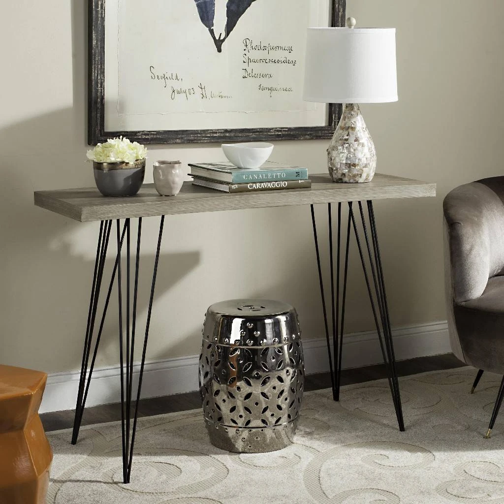Designed for the contemporary interior, this modern console complements minimalist interiors with the subtle geometry of its slender iron legs, and adds warmth with its neutral grey palette. An ideal landing for a tray of cocktails or for a chic entry. To maintain use only mild soap and water with a non-abrasive clean cloth