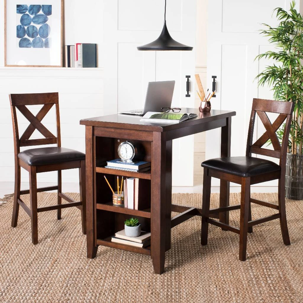 Transform any meal into a stylish dining experience with this 3-piece pub set. Constructed with solid mango wood, its mahogany finish compliments into any dining area décor. Its clever open storage shelves and classic x-back chairs make it an investment.