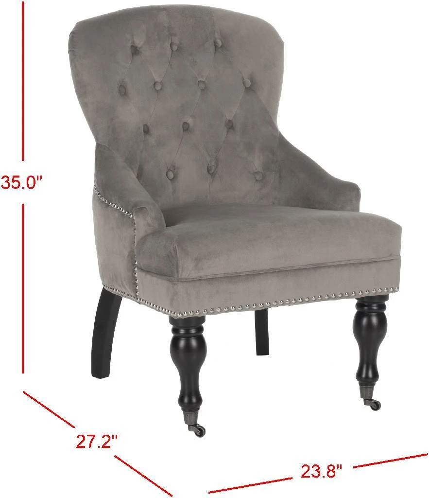Charming in every designer detail, the petite Falcon arm chair recalls richly upholstered parlor and boudoir chairs from a gentler era. Falcon is updated with cotton velvet upholstery in mushroom taupe, and features silver nail head trim, sloped arms and birch wood spindle legs with java finish. Replete with traditional details, the Falcon chair comes with front casters for easy mobility. To prevent overall soiling, frequent vacuuming or light brushing is recommended. Cushions and pillows should be turned on a weekly basis. Down-filled cushions should be brushed rather than vacuumed. Spot clean, using a mild water-free solvent or dry cleaning product. Only a professional cleaner should undertake a complete overall cleaning. The use of steam or water-based cleaners may cause excessive shrinking or staining.