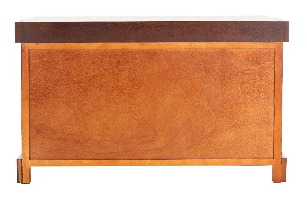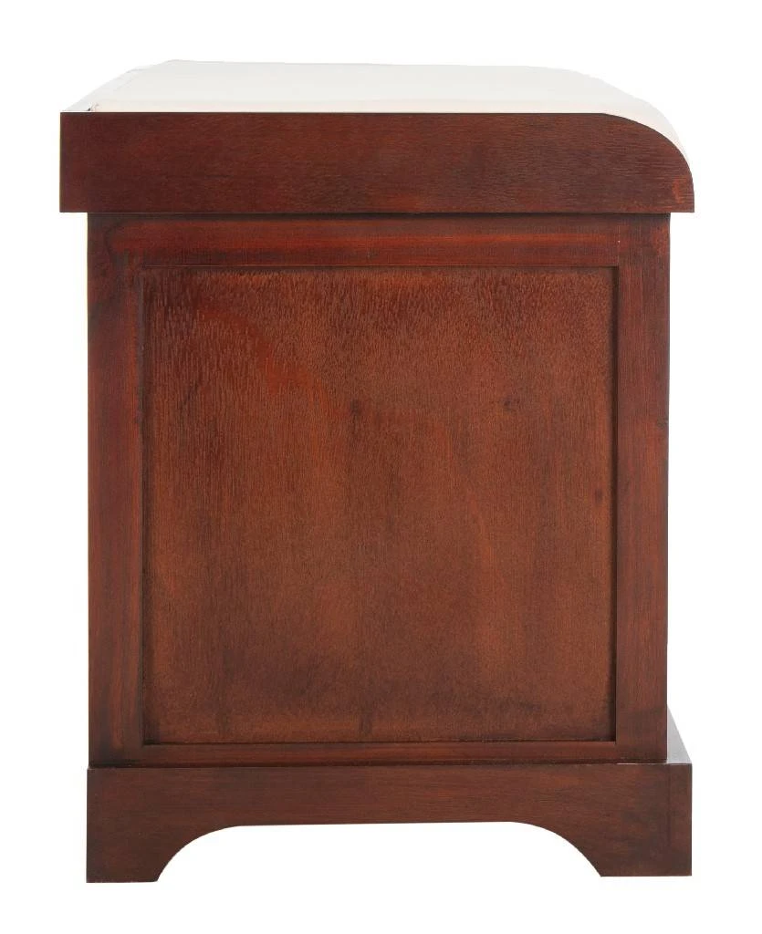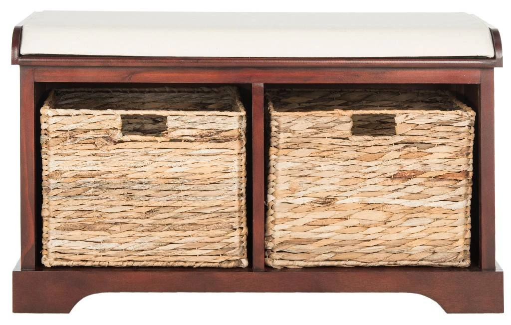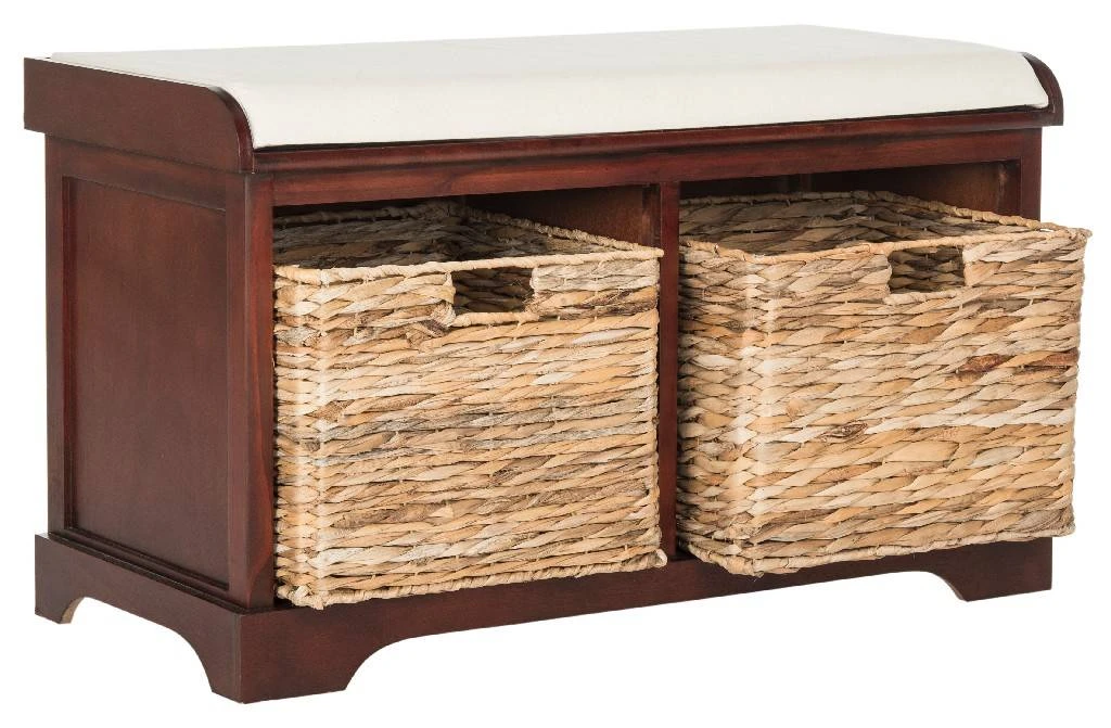 Sit back and relax. This pretty storage bench with cherry pine frame and linen upholstered seat is perfect for changing shoes in entry hall, and its woven baskets can hold towels and other necessities in a master bath. A versatile piece in any room.