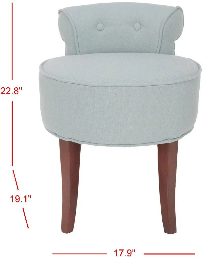 The adorable Georgia vanity chair is petite enough to tuck in a or , and brimming with feminine style. Graceful cherry mahogany-toned birch wood legs, deep seat and diminutive button tufted back are designed for indulgent comfort. Upholstered with silver blue polyester/viscose blend fabric with self-welting for a decorator touch. To prevent overall soiling, frequent vacuuming or light brushing is recommended. Cushions and pillows should be turned on a weekly basis. Down-filled cushions should be brushed rather than vacuumed. Spot clean, using a mild water-free solvent or dry cleaning product. Only a professional cleaner should undertake a complete overall cleaning. The use of steam or water-based cleaners may cause excessive shrinking or staining.