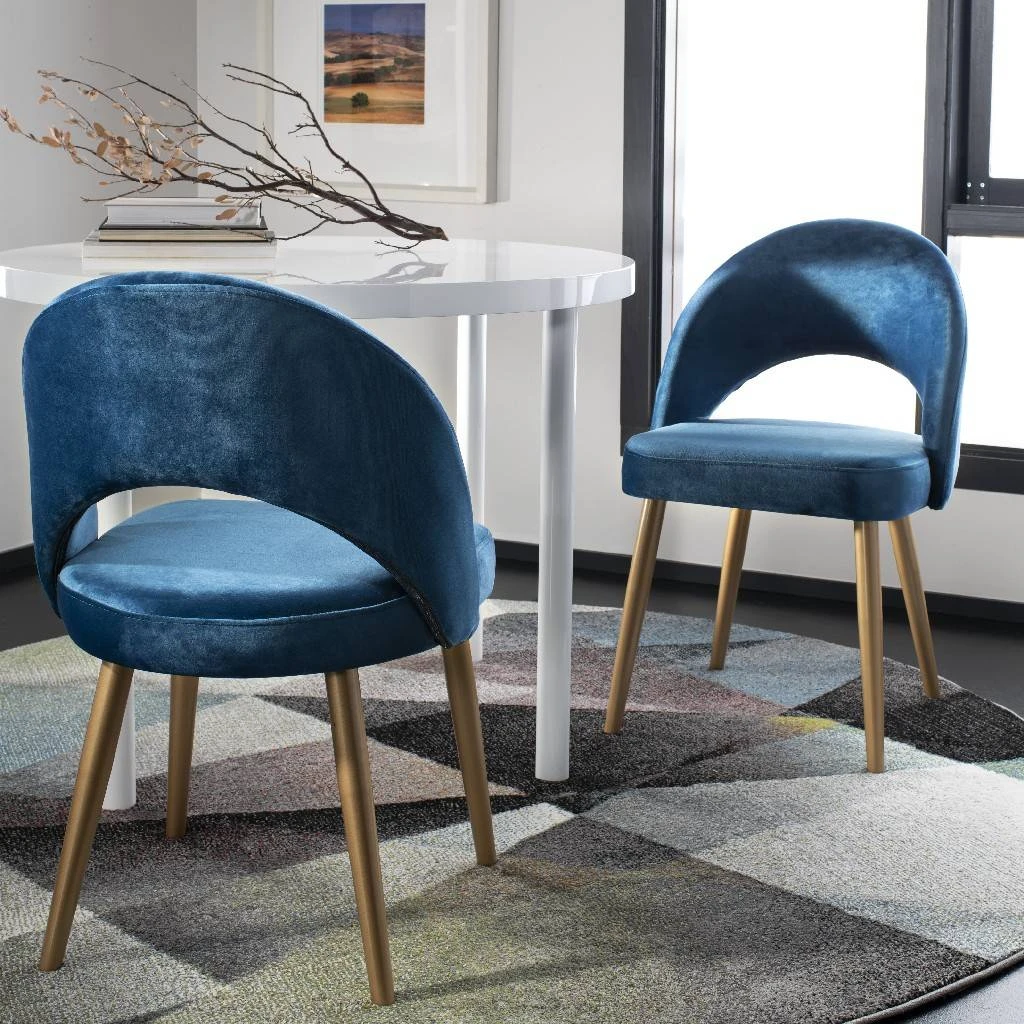 This elegant retro dining chair brings contemporary romance to the dining room. Designed with vintage-style charm, it’s upholstered in luxurious navy velvet and features a radiant gold metal finish. Its stylish cut-out back creates instant glamour for your dining room. To maintain use only mild soap and water with a non-abrasive clean cloth