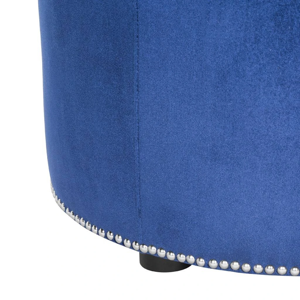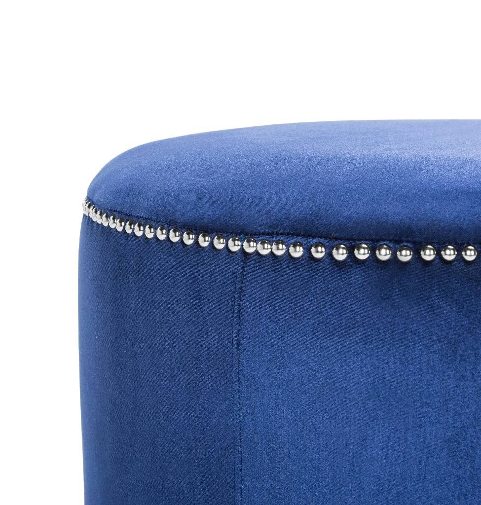 The antidote to boxy rooms with rectangular furniture, this classic round ottoman adds welcome curves to any living space. The Hogan ottoman’s fashion-right royal blue upholstery is accented with nail head trim, while black-finished beech wood legs provide transitional flair.
