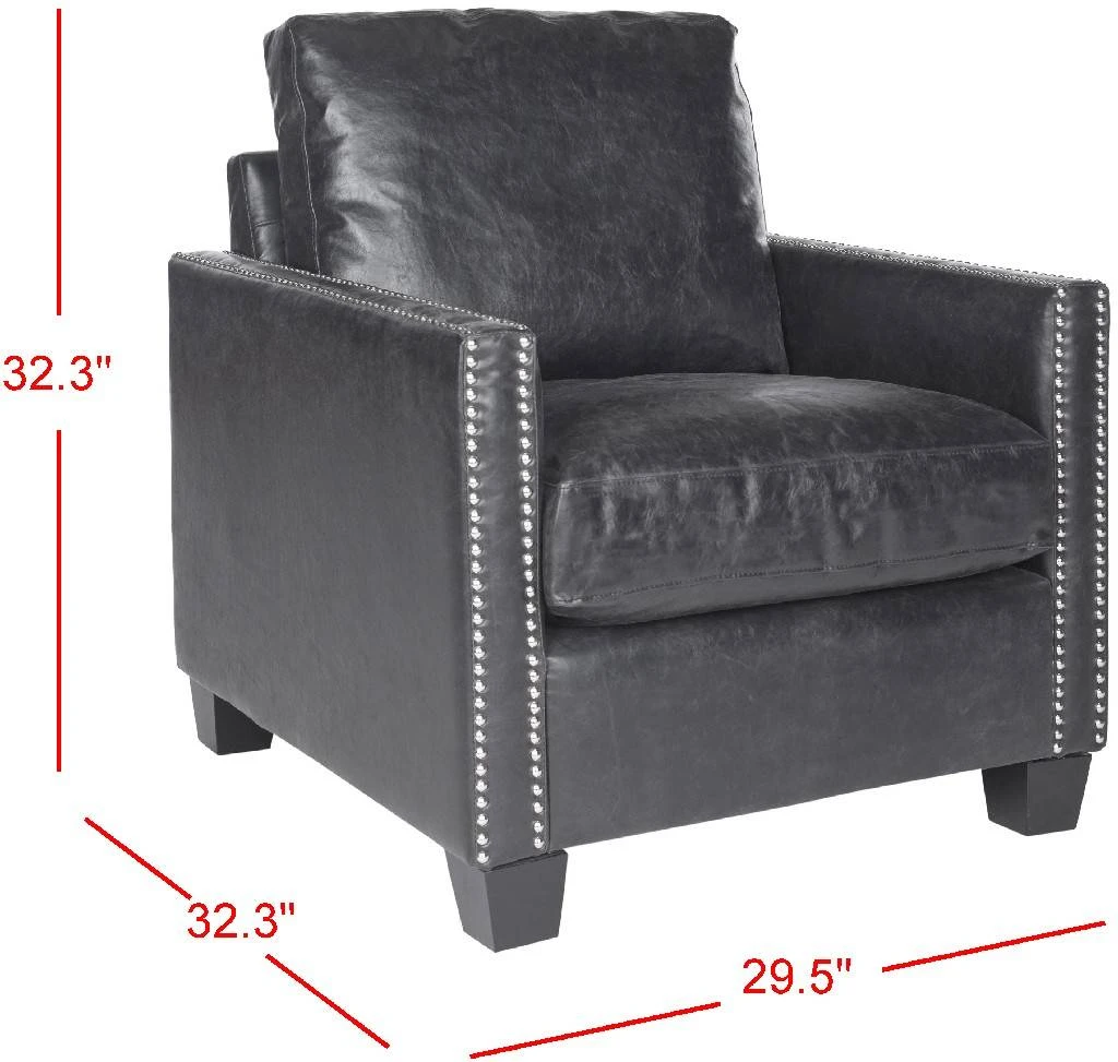 The plush comfort of overstuffed cushions is seductively inviting in the transitional Horace club chair. Artfully upholstered in antique black PU leather, and generously studded with silver nail heads, this arm chair invites lounging in high style.