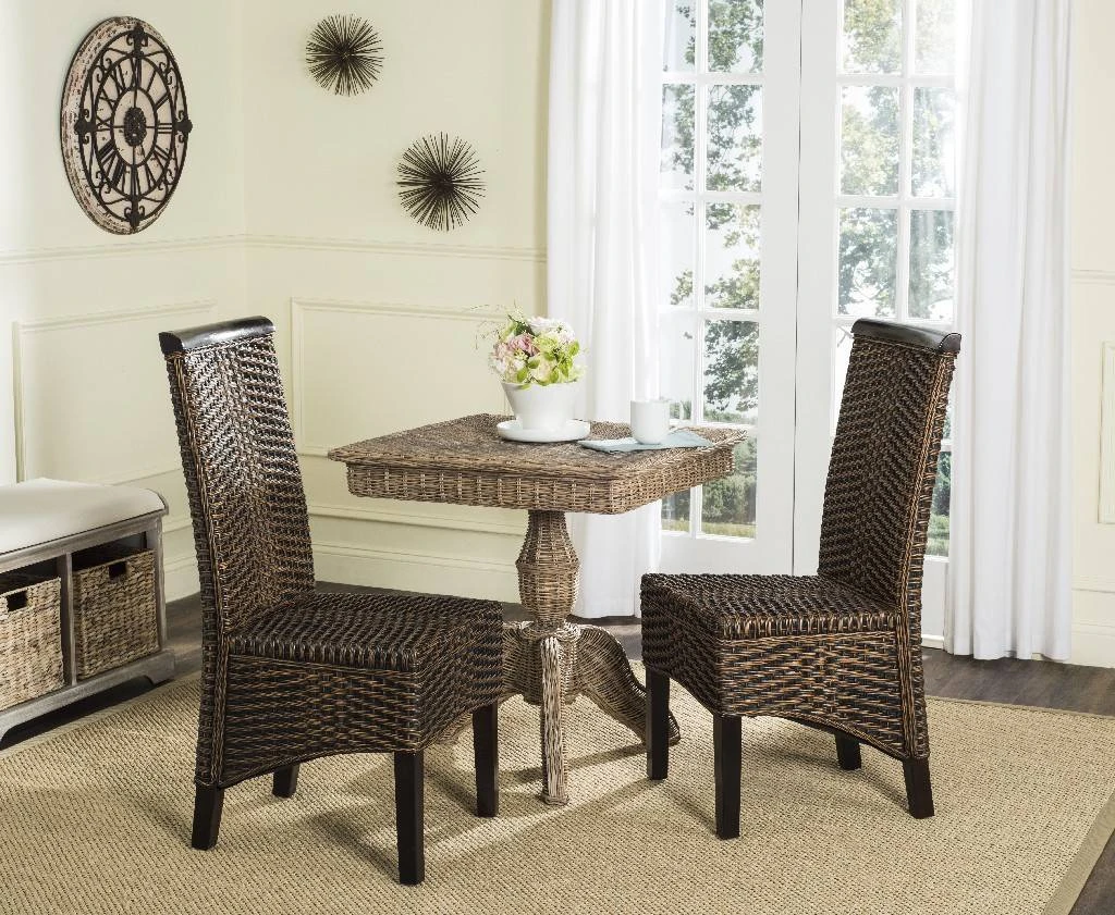 Rich in designer details, this transitional set of two brown multi wicker dining chairs adds a luxury look to dining rooms, kitchens and casual spaces. Crafted of rattan with contrasting legs and accent bands on seat backs of hardwood in a dark mahogany finish. Disclaimer: Please note that this item is crafted of rattan, and none are exactly alike. Each item will have different shadings, patterning and variations in color. Dust regularly with a soft, dry cloth. Never use oiled or treated cloths on lacquered finishes. Some finishes can be wiped with a damp (not wet) cloth, followed at once by rubbing with a dry cloth to remove fingerprints and smudges. For persistent spots, gently clean with a soft cloth and a solution of water and mild soap, make sure to wipe dry. Use adhesive felt pads, coasters and placemats to protect your furniture.