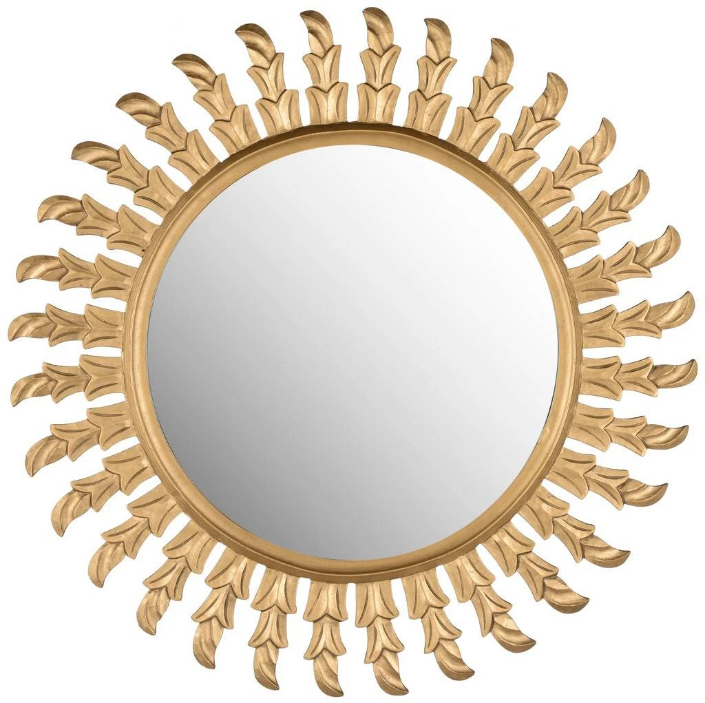 Sun worship takes on new meaning with the round Inca Sun mirror by Safavieh. This unique sunburst in a lustrous gold finish is created with a classical leaf motif inspired by the form of ancient carved arrows. [Use this stellar accessory to add timeless elegance to a , or entry hall.]
