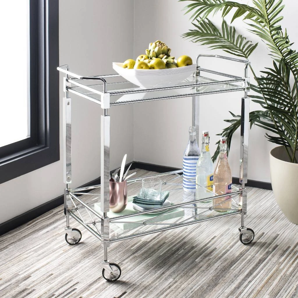 Imbibe in style with this sleek 2-tier rectangle bar cart. Inspired by the decadence of Art Deco design, its luxurious layers of glass and chrome are perfect for displaying drinkware, beverages and accessories. It brings a sophisticated touch to any room. Dust regularly with a soft, dry cloth. Never use oiled or treated cloths on lacquered finishes. Some finishes can be wiped with a damp (not wet) cloth, followed at once by rubbing with a dry cloth to remove fingerprints and smudges. For persistent spots, gently clean with a soft cloth and a solution of water and mild soap, make sure to wipe dry. Use adhesive felt pads, coasters and placemats to protect your furniture.